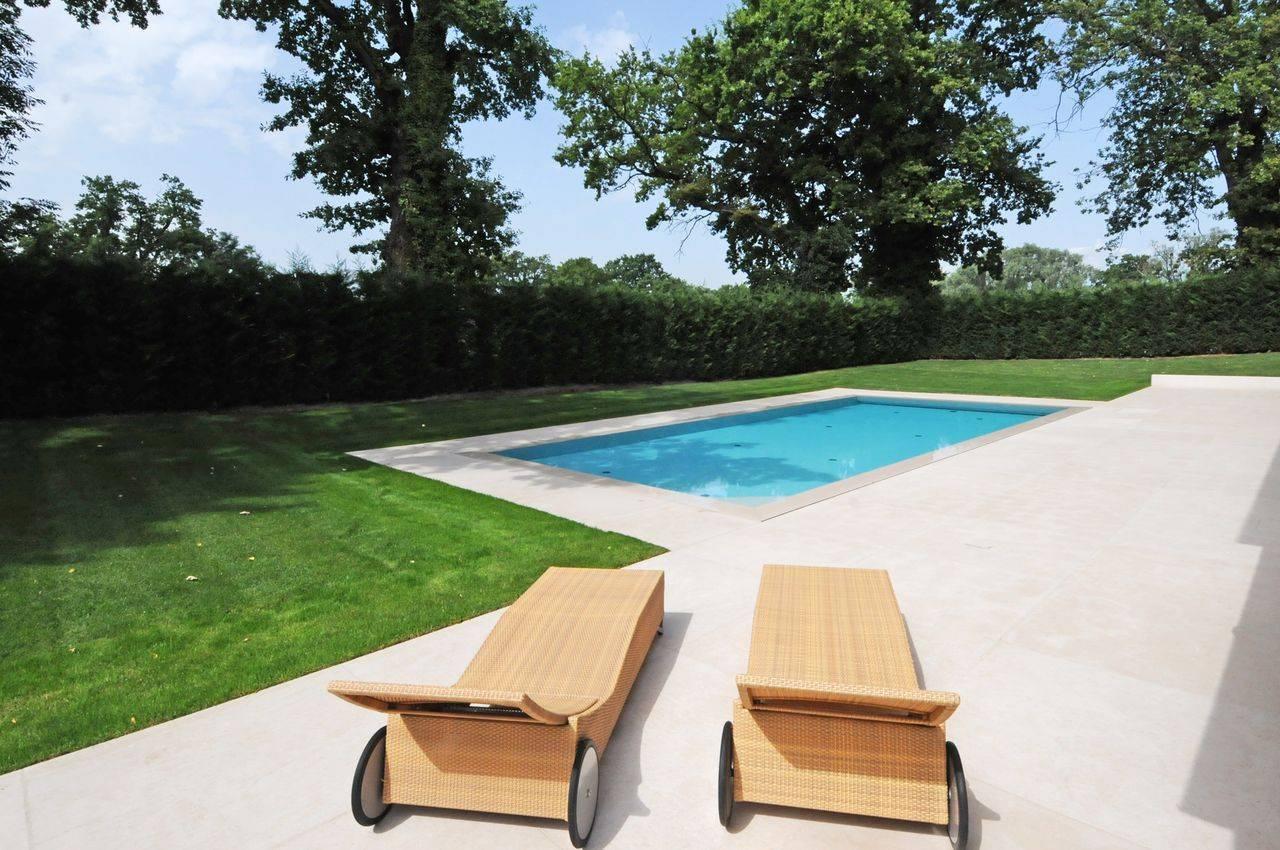 The ground floor consists of an entrance hall with high ceilings, a large living room, a dining room and a large TV/library area. All these rooms have direct access to the terrace. A kitchen with central island, as well as a guest toilet with sink complete the level.