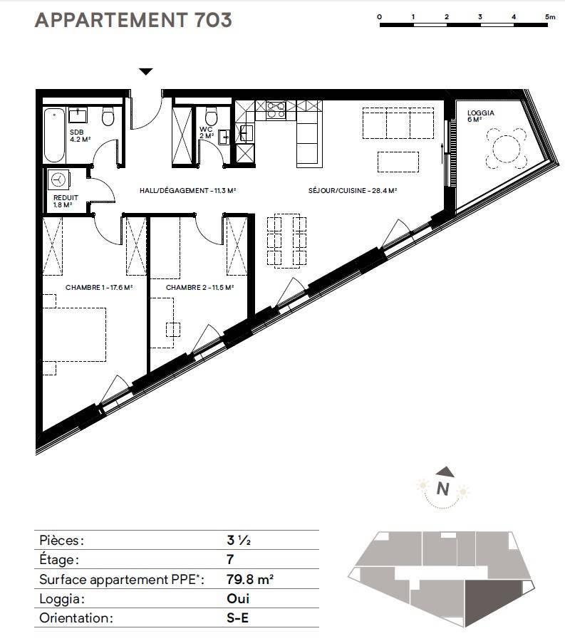 The proposed apartment, facing South-East on the 7th floor, is arranged as follows: