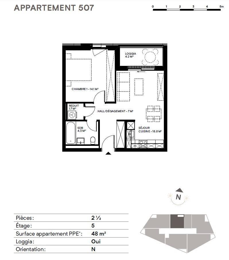 The proposed apartment, facing north on the 5th floor, is arranged as follows: