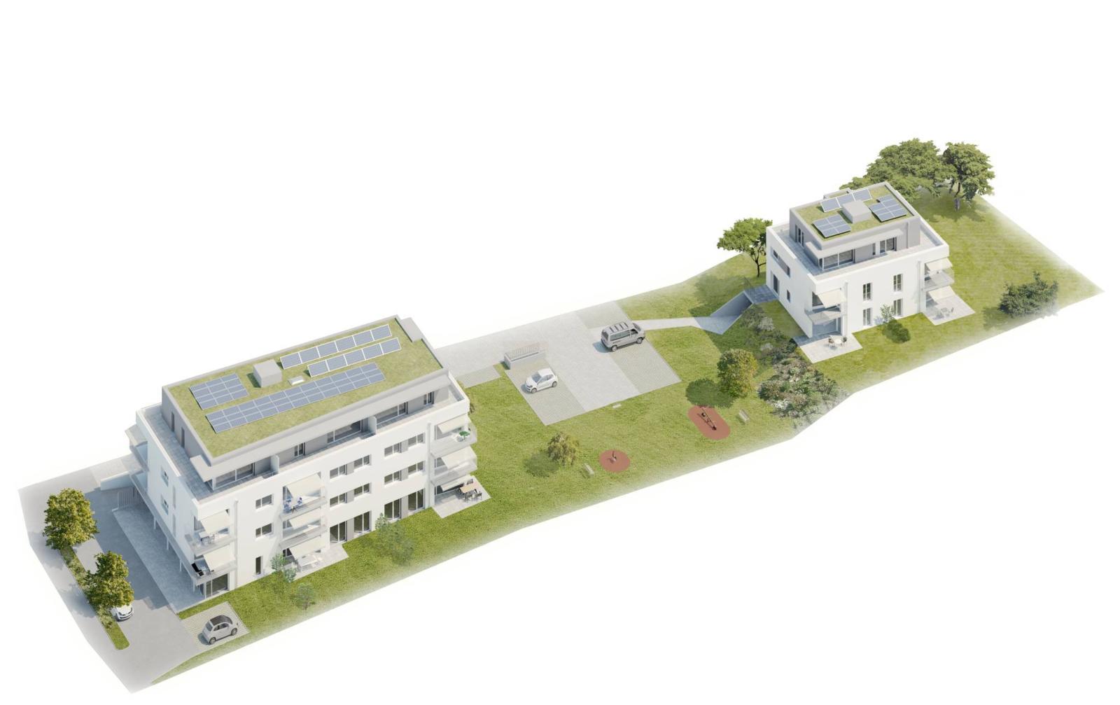 - Green areas with trees and a playground liven up the space between the two buildings.