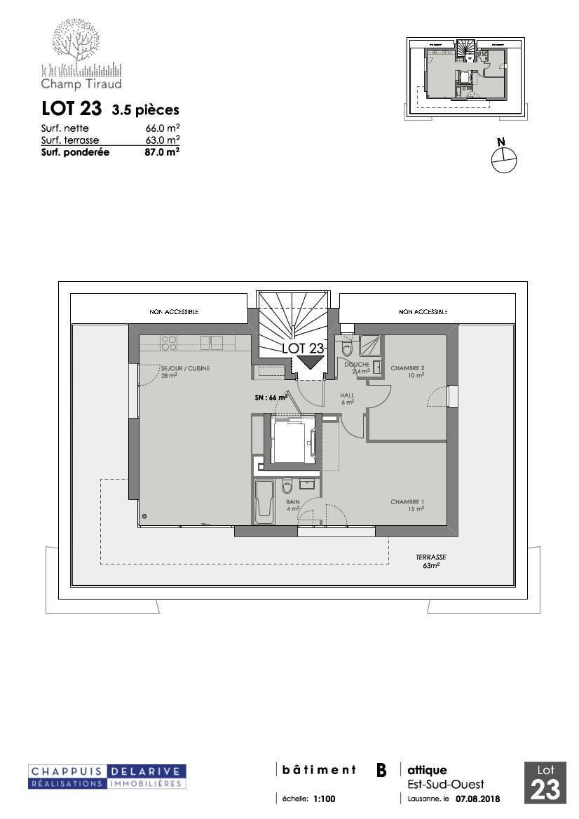 The project takes into account the orientations, visual clearances and constraints of the place to define the different typologies, which range from 2.5 to 4.5 rooms. All the apartments have balconies facing mainly to the South. Attics with large terraces crown each of the two buildings.