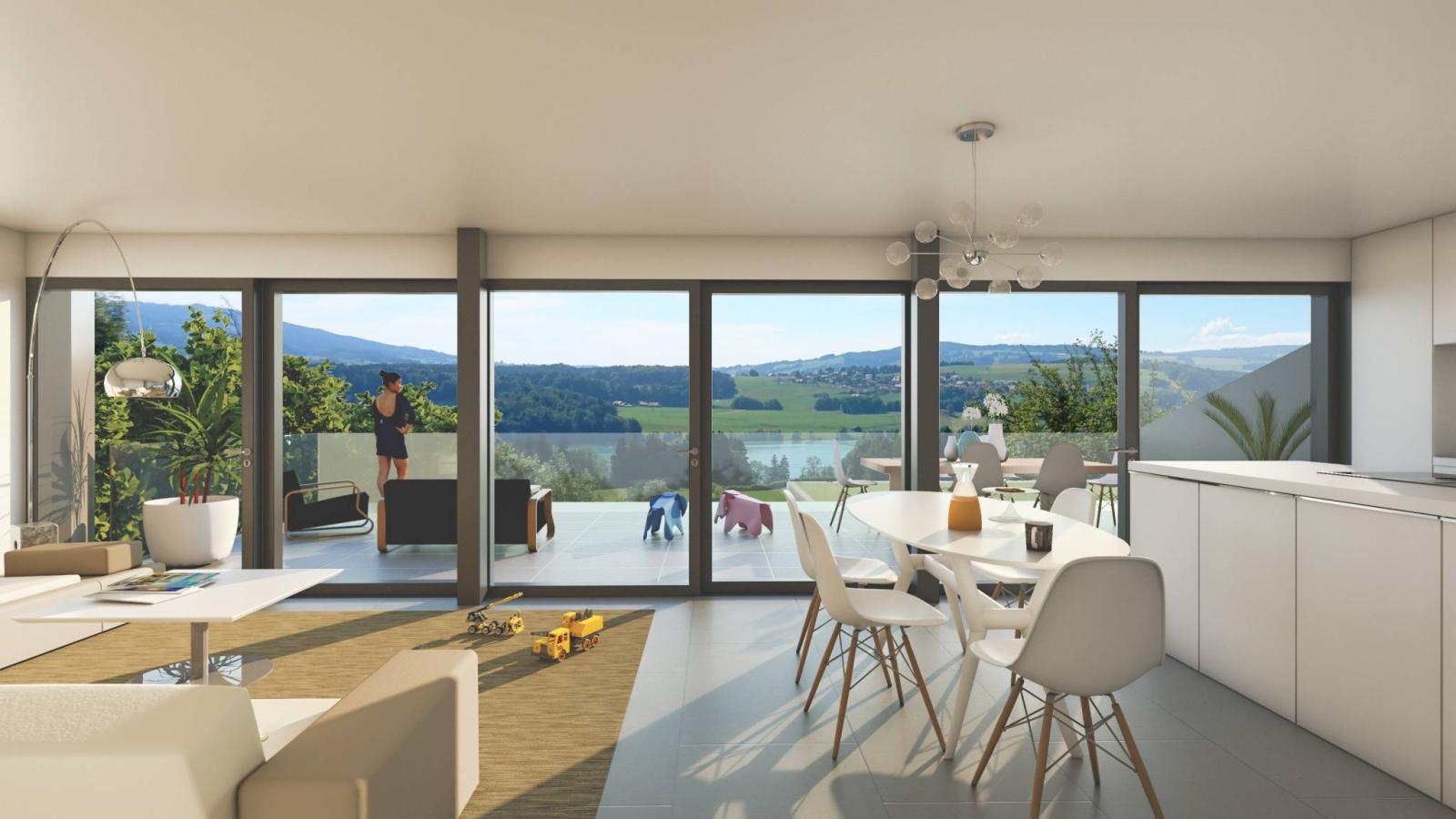 The remaining 3 apartments are fully completed with high-end finishes. In addition, a cellar in the basement is attached to each lot. The apartments are sold with 1 large indoor parking space and 1 outdoor space. The panoramic view of The Lac de la Gruyère, the Gibloux and the calm will make you love your new residence. Delivery in progress. Come visit the last 3 apartments without delay.
