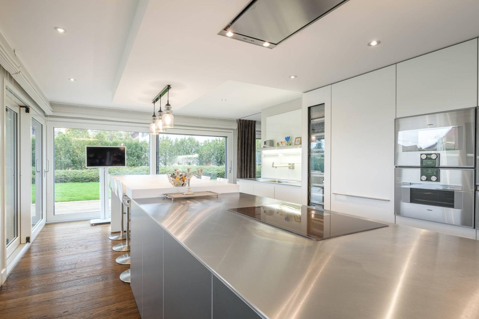 The second wing houses the "Bulthaup" kitchen, magnificently equipped with high-quality household appliances, and the dining room leading to the wooden terrace.