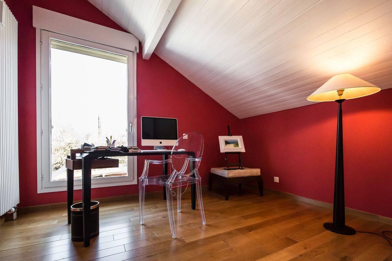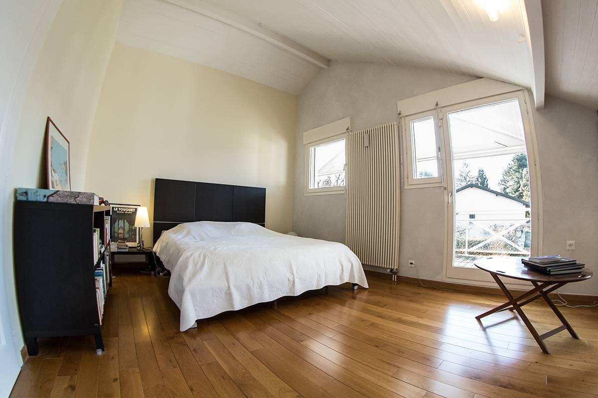 The upper floor offers three bedrooms, two of which have access to a large terrace with a view of the Jura, and two bathrooms with toilets.