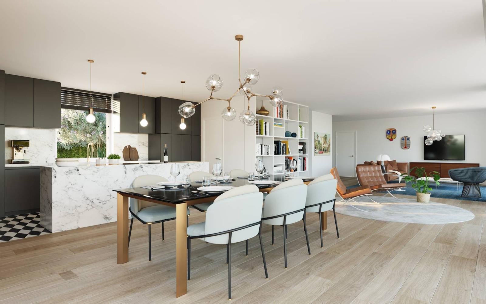 The ground floor offers a beautiful open and very bright space. It is composed of a living room and a dining room in a row, a fitted and equipped kitchen, and an entrance hall with guest WC.