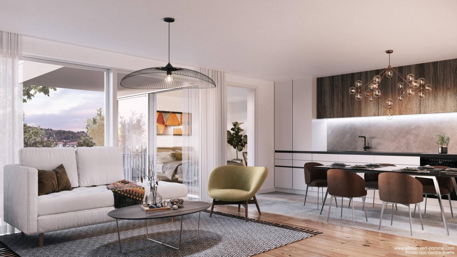 This 3.5 room apartment is on the 1st floor and its living area is 78.5 m², with a balcony/loggia of 8 m. It is composed of an entrance hall, a kitchen open to a dining room, a living room opening onto the balcony/loggia, two bedrooms, a bathroom and a shower room.