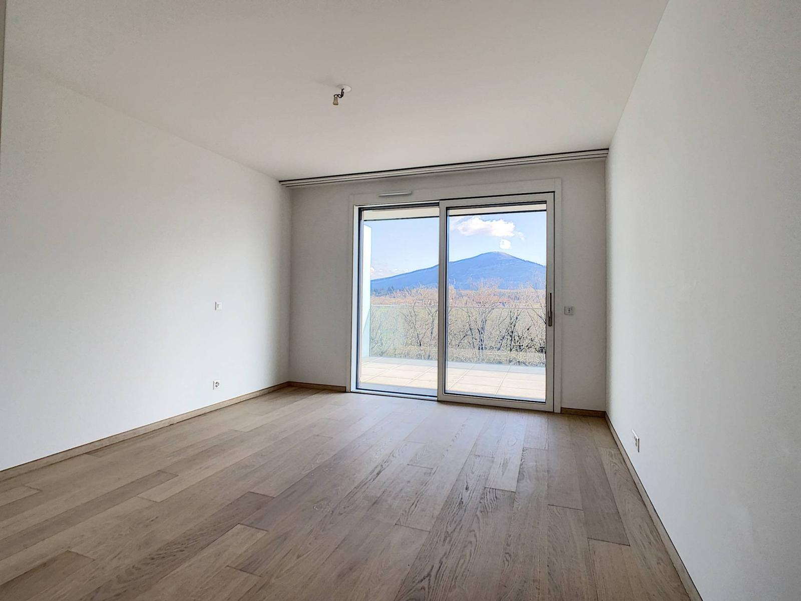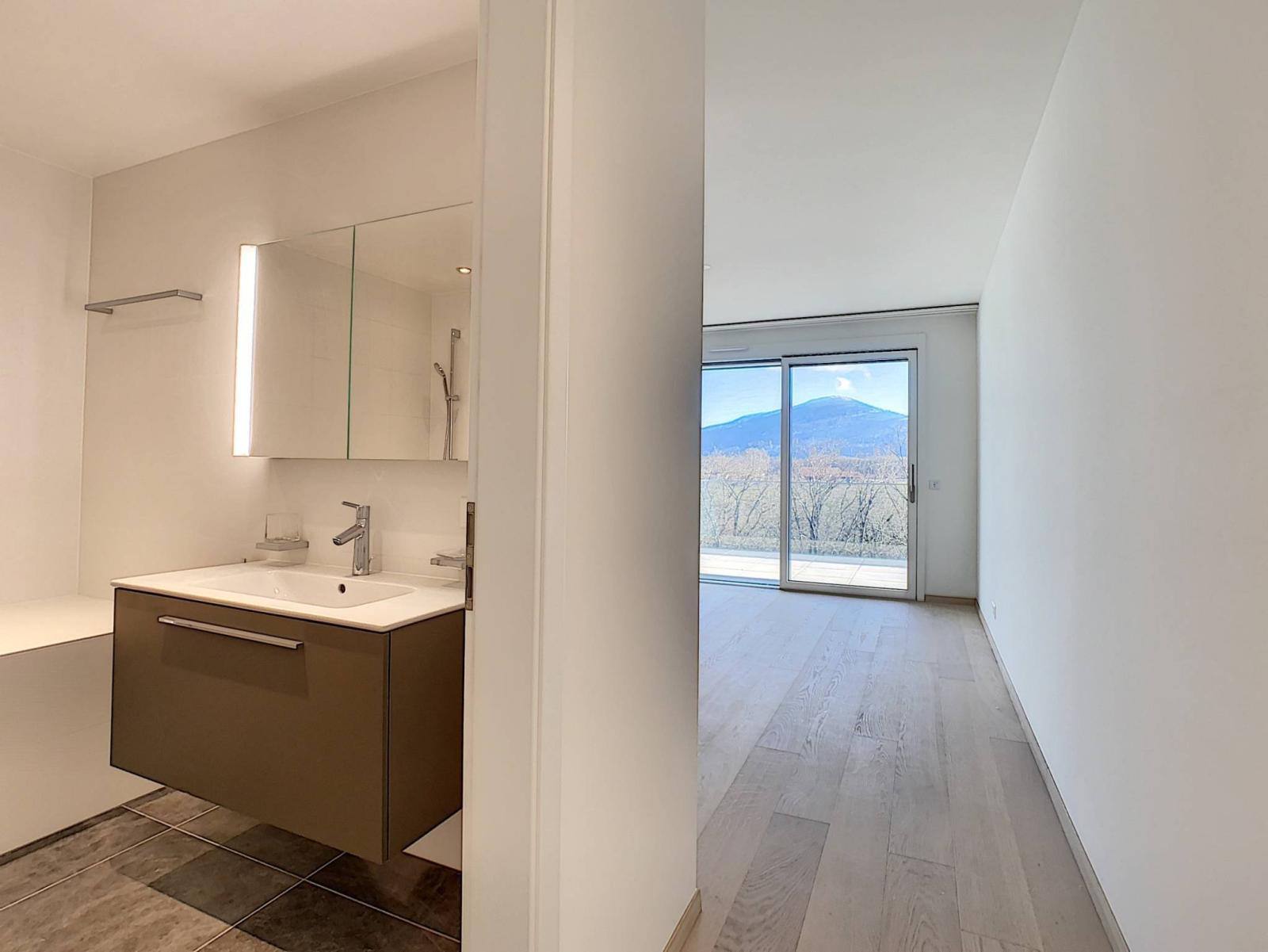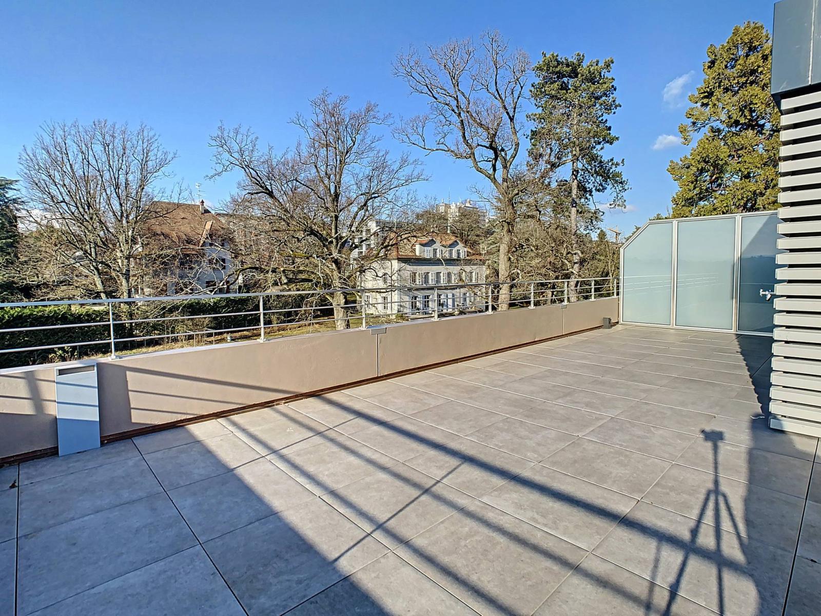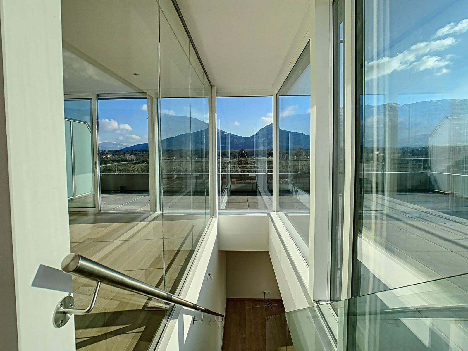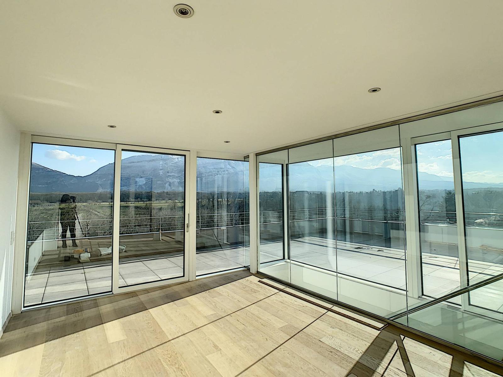 The apartment benefits from high-end finishes, a high-performance home automation system and two large terraces totaling 140 m facing due south, with a clear view of the Salève.