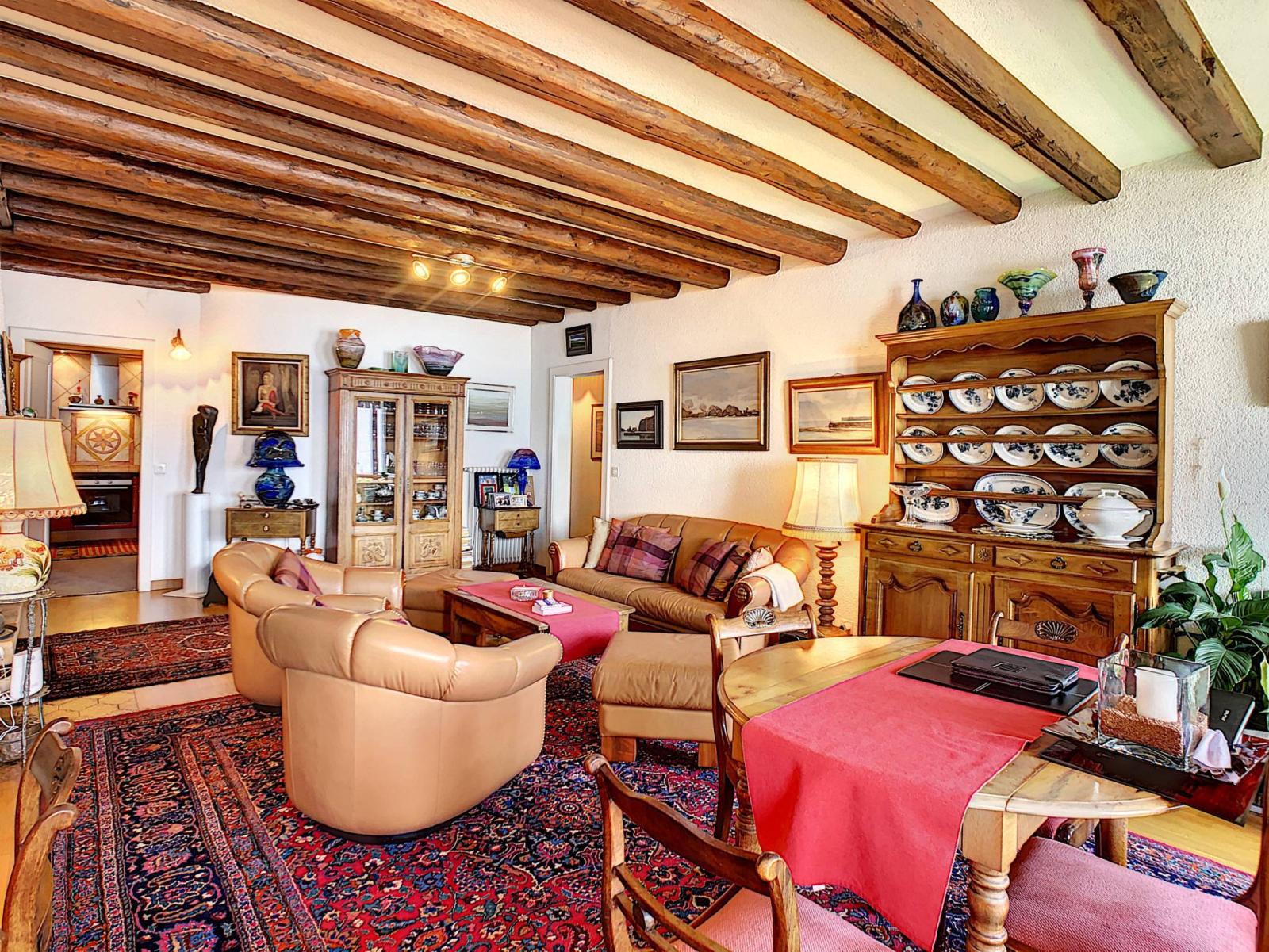 The house would be ideal for a buyer wishing to live there, while benefiting from rental income by renting out the other lots. The current owner lives in the 4.5 room apartment on the 2nd floor. With this accommodation for example, it would be quite possible to transform it into a spacious duplex with the two studios on the 3rd floor.