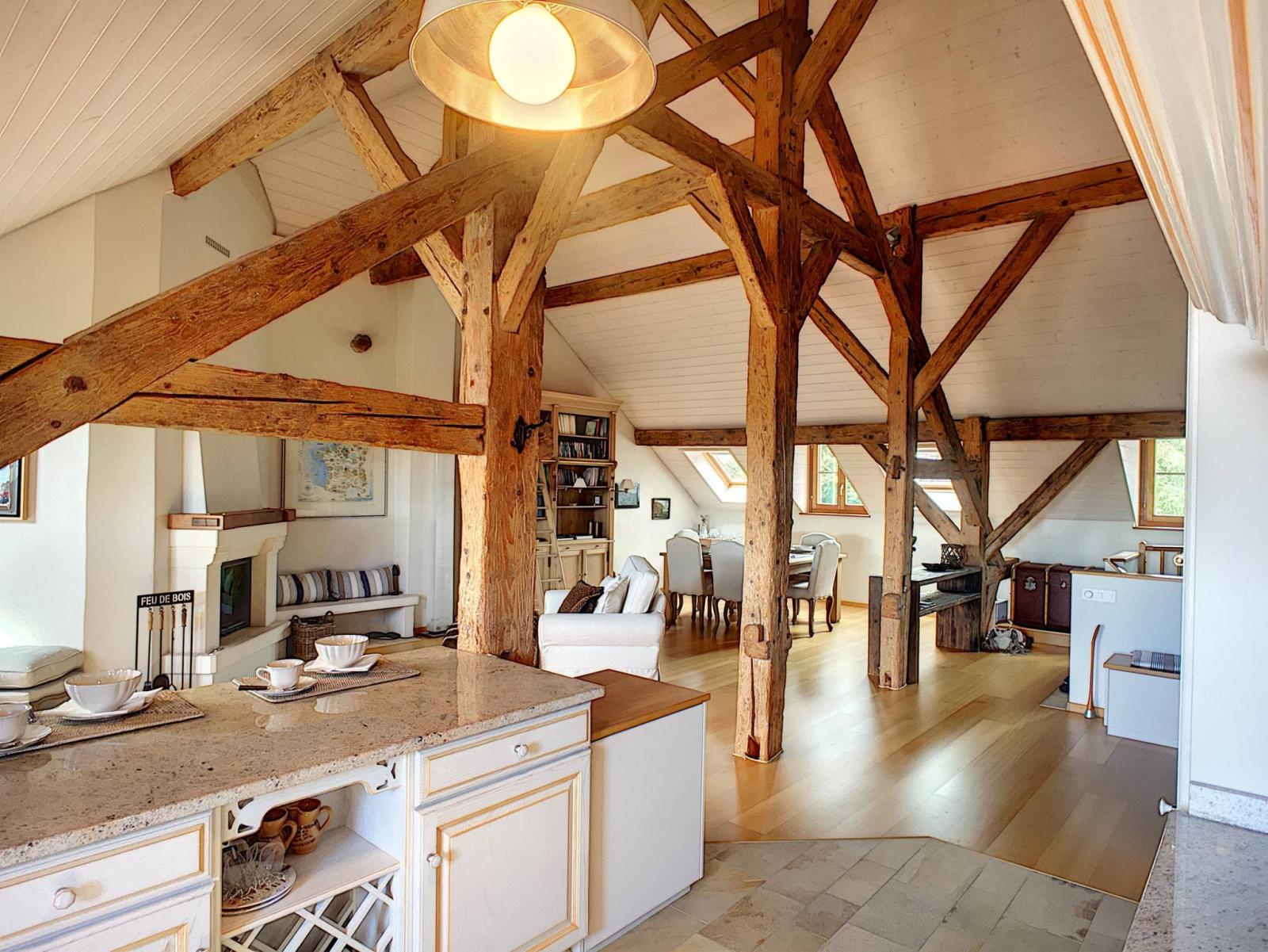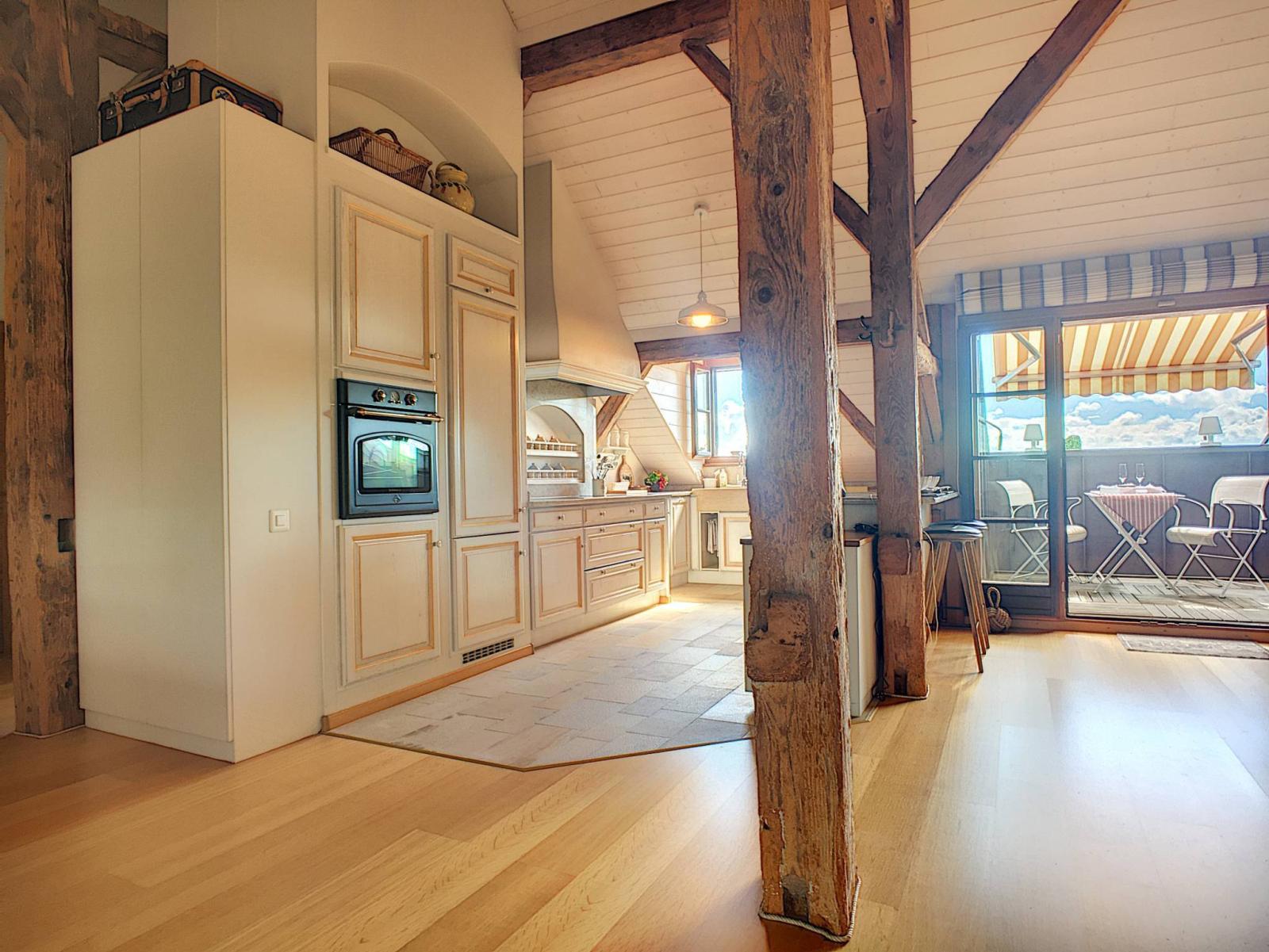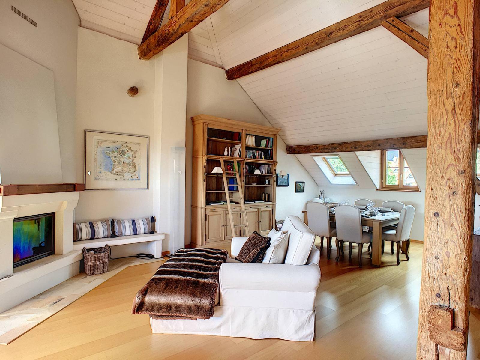 In an old farmhouse renovated in 2002, with only two apartments per entrance, BARNES La Côte presents this peaceful setting combining old-world charm and modernity. On the first and last floor, this 4.5-room apartment located under the roof offers a useful surface area of approximately 145 m² with a terrace overlooking the lake and Mont Blanc.