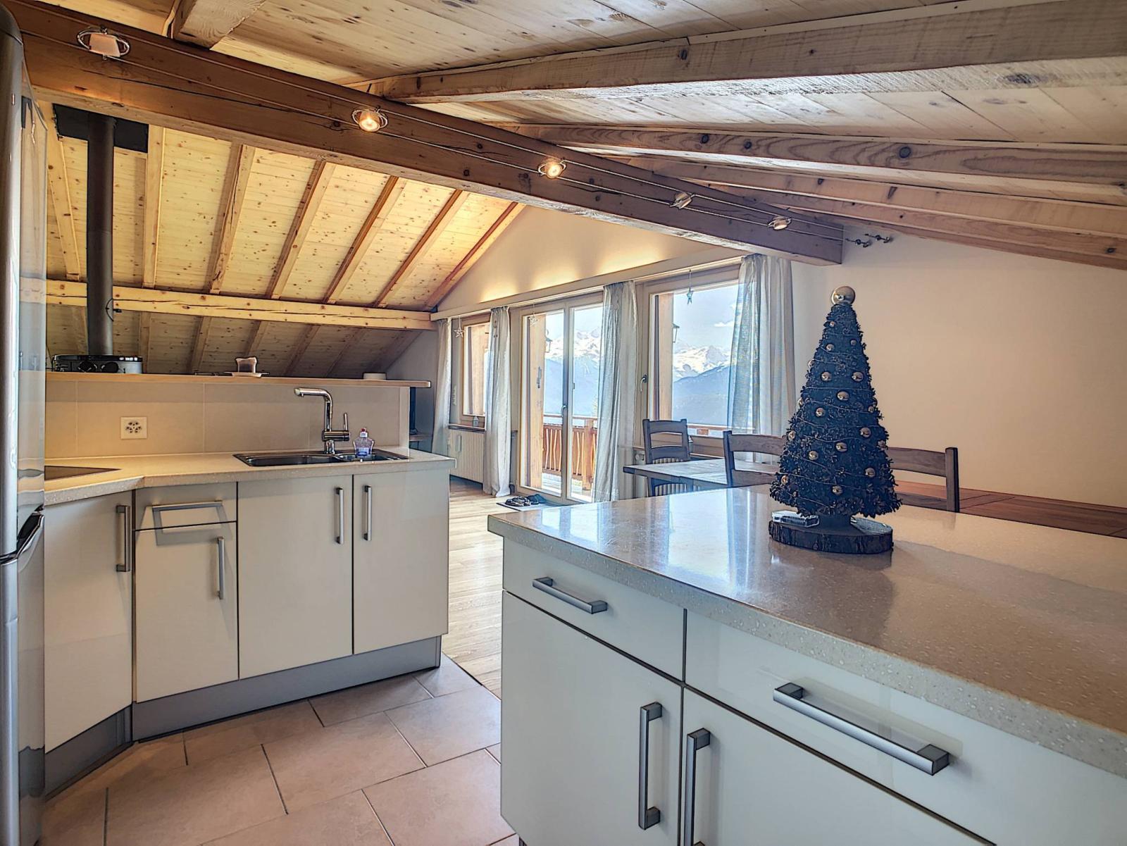 This beautiful attic apartment is located in a small residence to the east of Crans-Montana, not far from the Violettes ski lifts and the centre of Montana. It enjoys a beautiful view of the Alps. Bright, crossing and in excellent general condition, this apartment is ideal for spending stays on the Haut-Plateau.