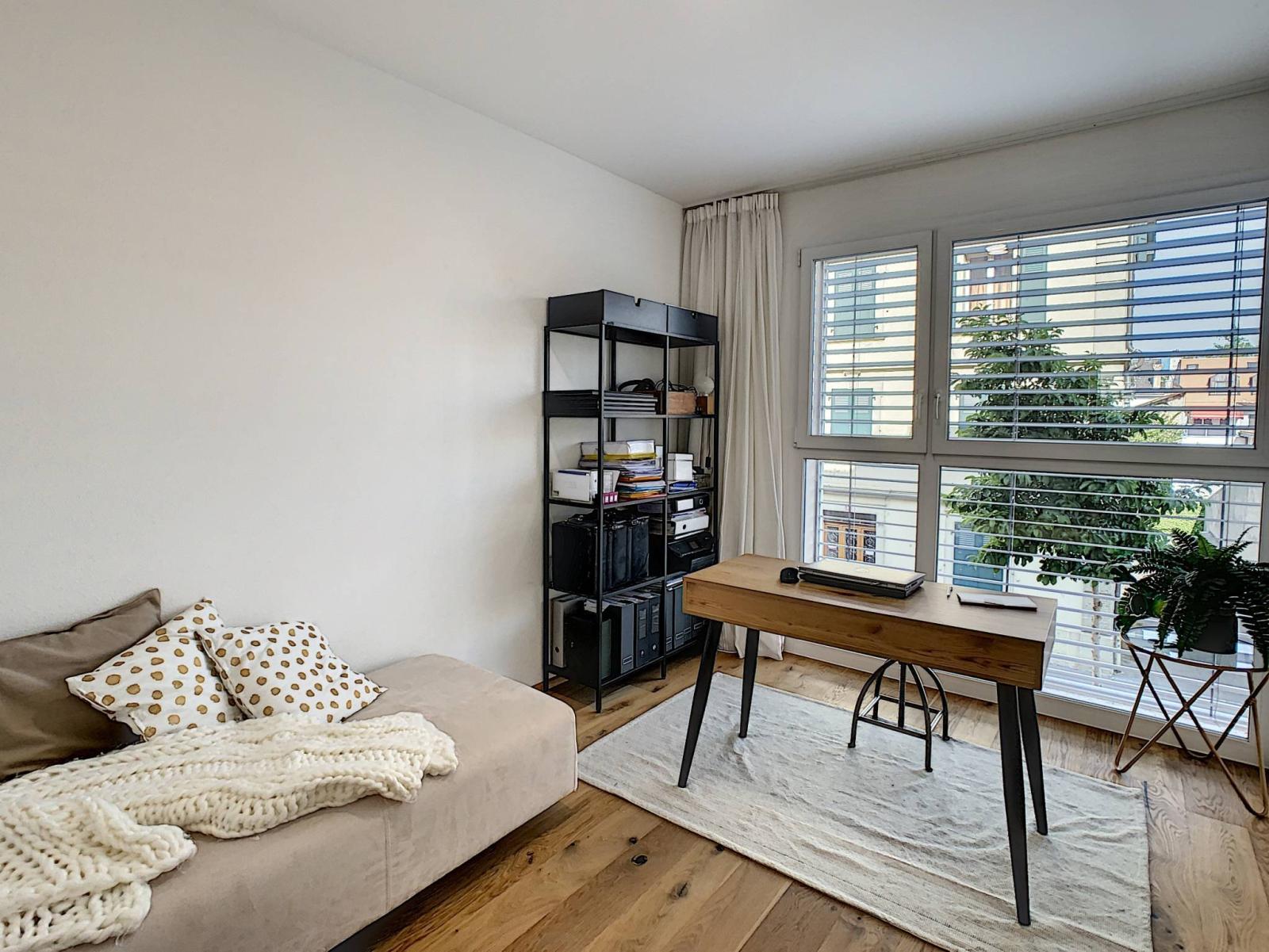 Located in the historic city center of the beautiful city of Yverdon-les-Bains, this magnificent property located on the 1st floor of a PPE built in 2013 will seduce you with its high-end services and its beautiful volumes. In a refined and modern style, this 4.5 room crossing apartment offers a living area of approximately 115 m² and a beautiful ceiling height. It has an entrance hall - with wall cupboards - giving access to the very well-appointed kitchen, the living / dining room as well as the spacious balcony of approximately 27 m². The apartment has two Master Bedrooms with dressing rooms and adjoining shower rooms / WC, one of which has direct access to the balcony as well as a bedroom which is currently used as an office. A bathroom with washing column also completes this accommodation.