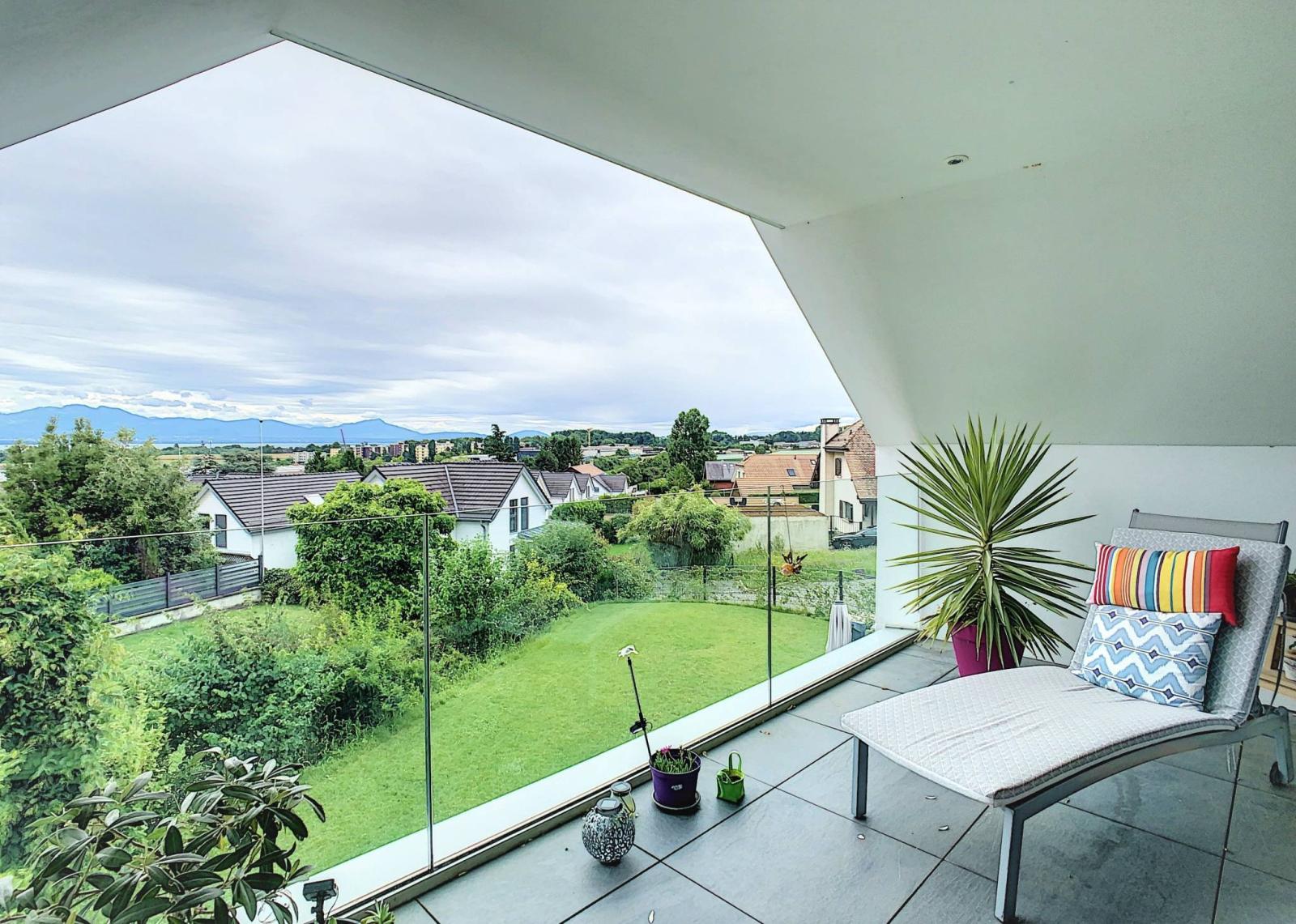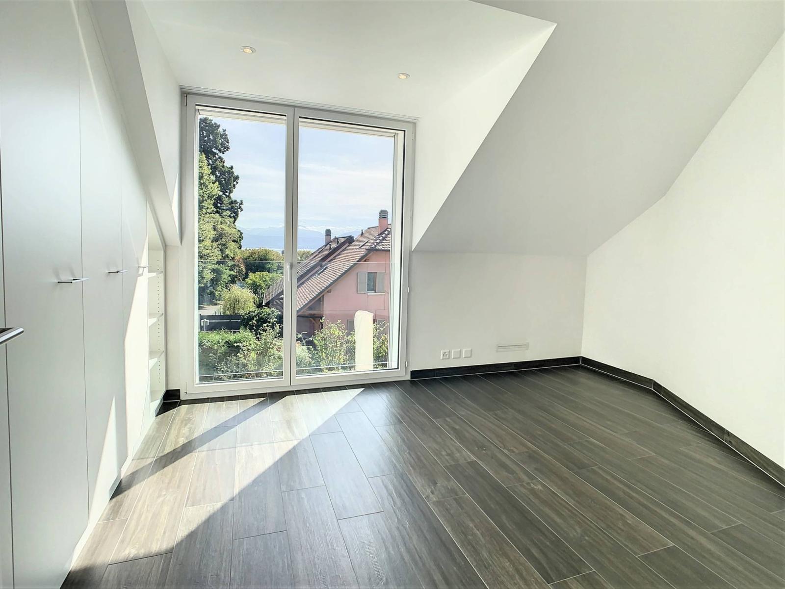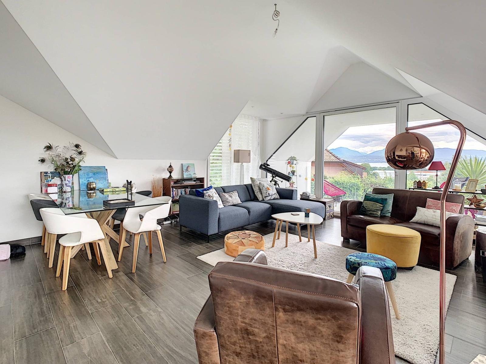 The apartment has 3 bedrooms, 3 bathrooms and the living room offers a living space of approximately 60m² with a beautiful open view of the lake and Mont-Blanc.