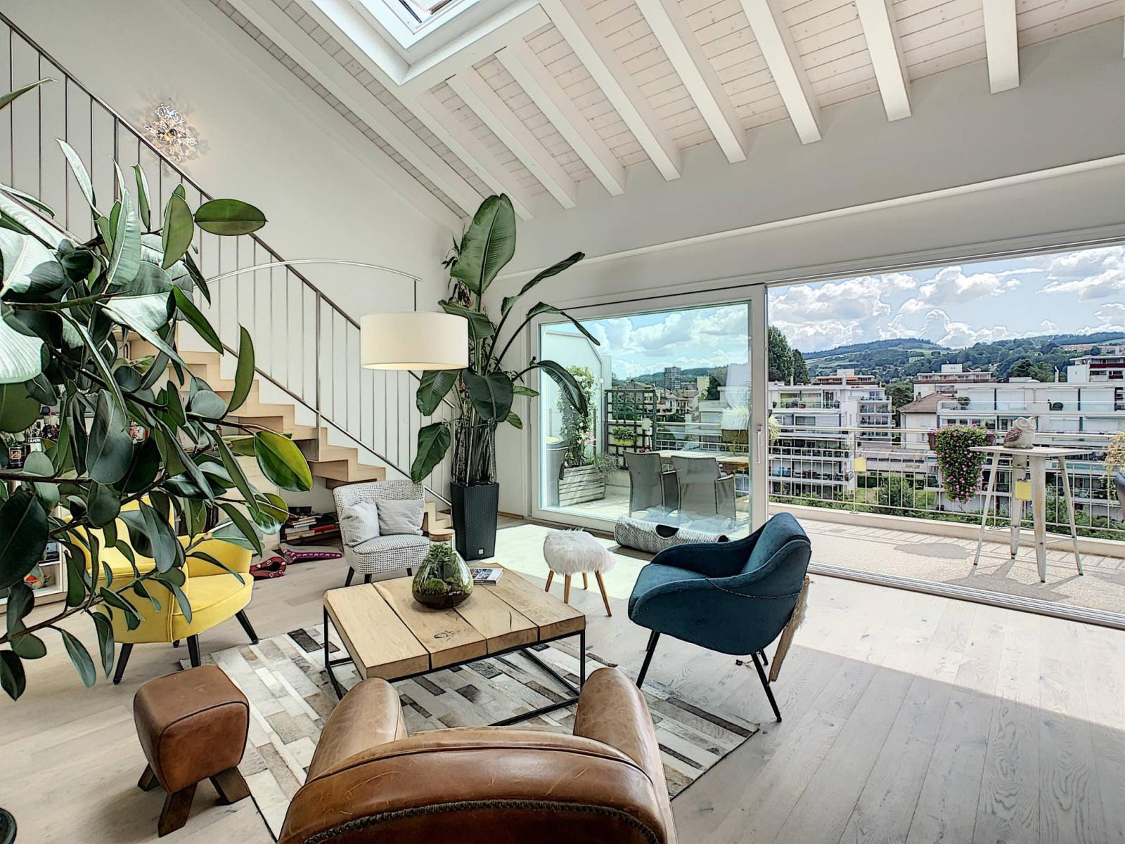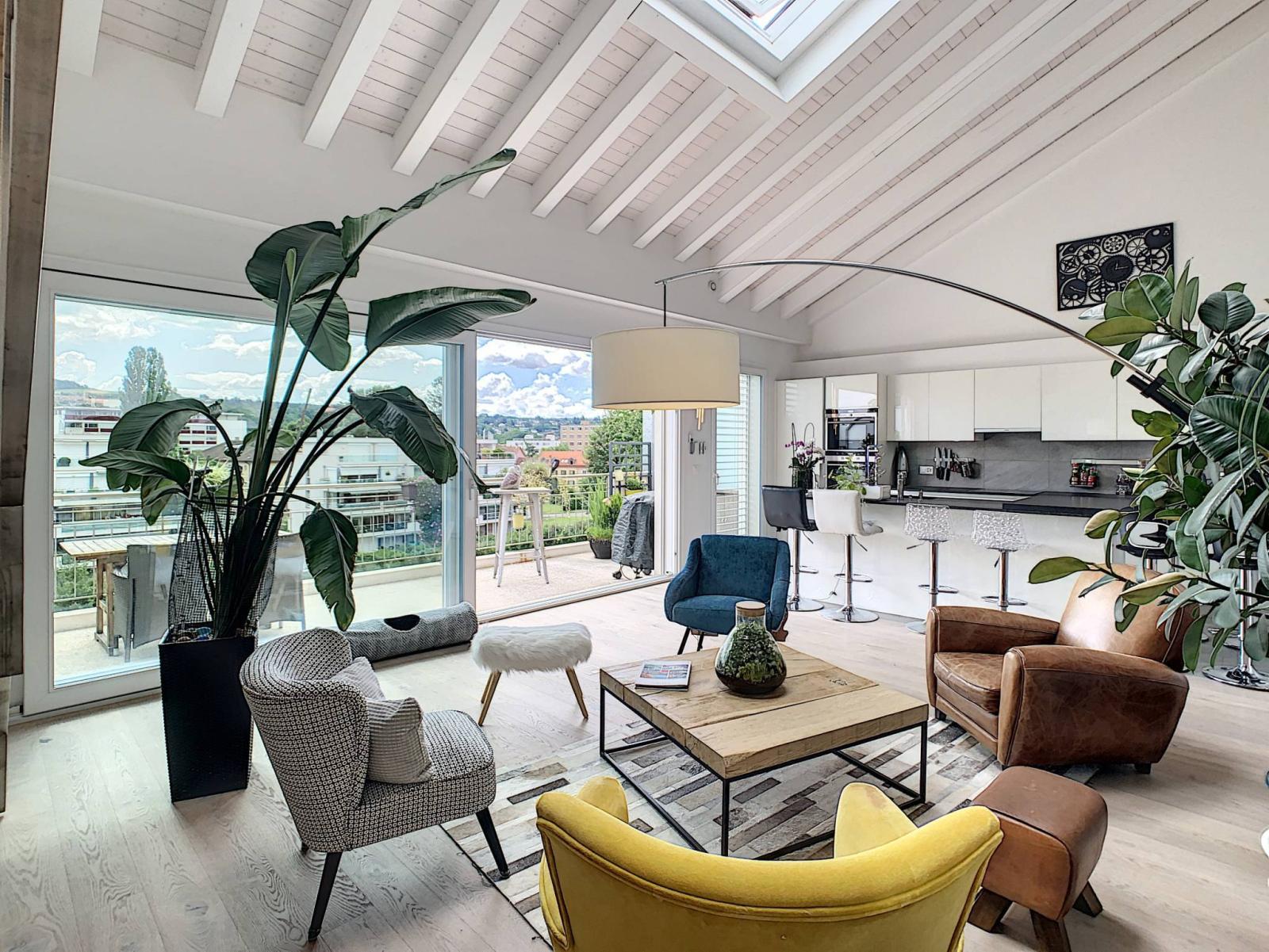 A stone's throw from the historic city center of the beautiful city of Yverdon-les-Bains, this property located on the 4th and top floor of a PPE built in 2013 will seduce you with its typology and its beautiful volumes. In a refined and modern style, this 3.5 room crossing apartment offers a beautiful weighted surface area of approximately 150 m².