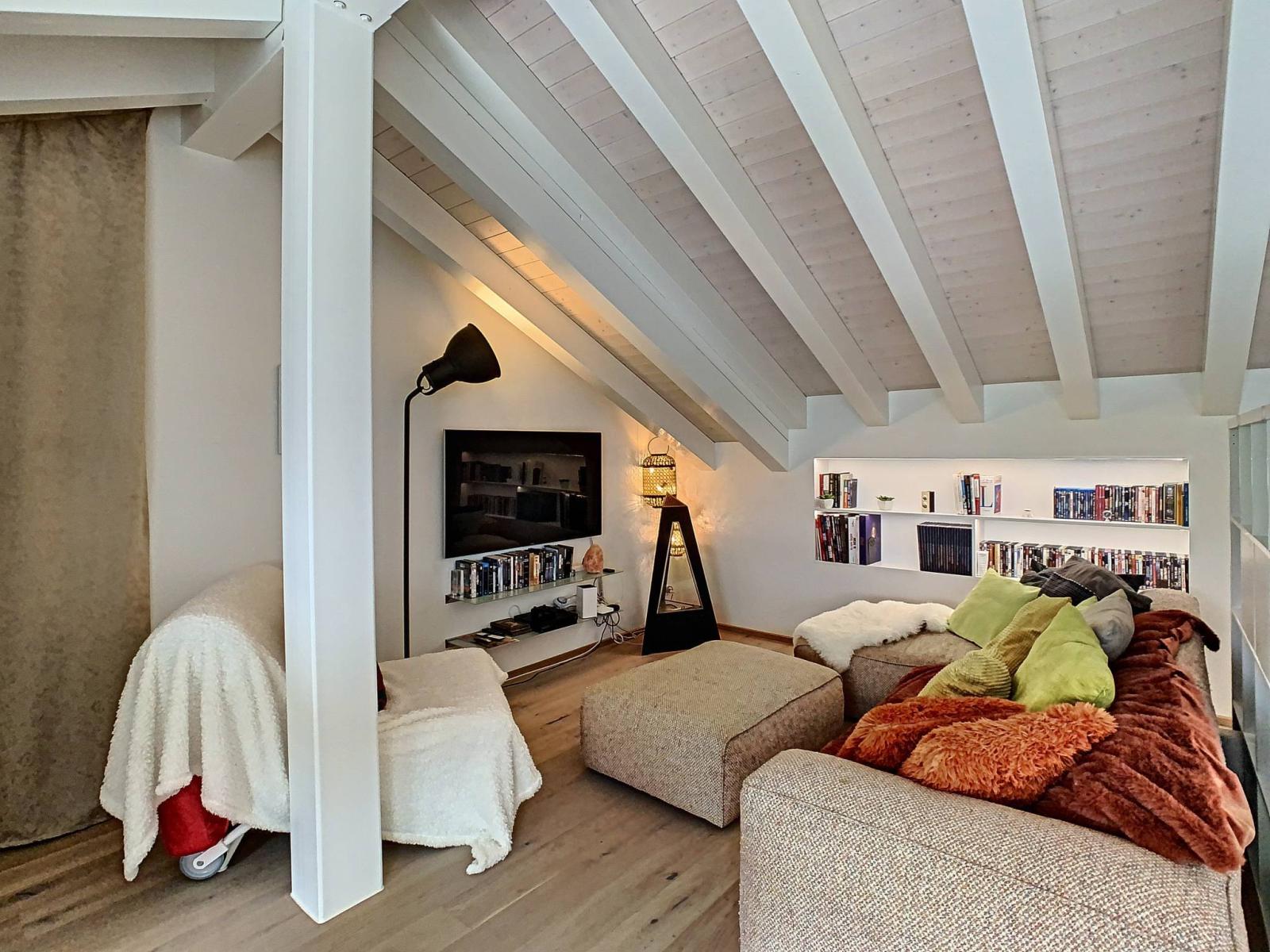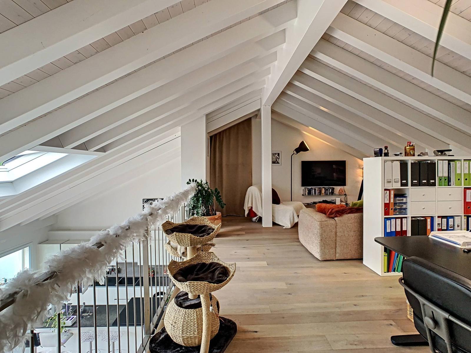 Finally, the apartment benefits from a beautiful mezzanine open to the living room, now converted into an office. It is possible to adapt it according to your needs.