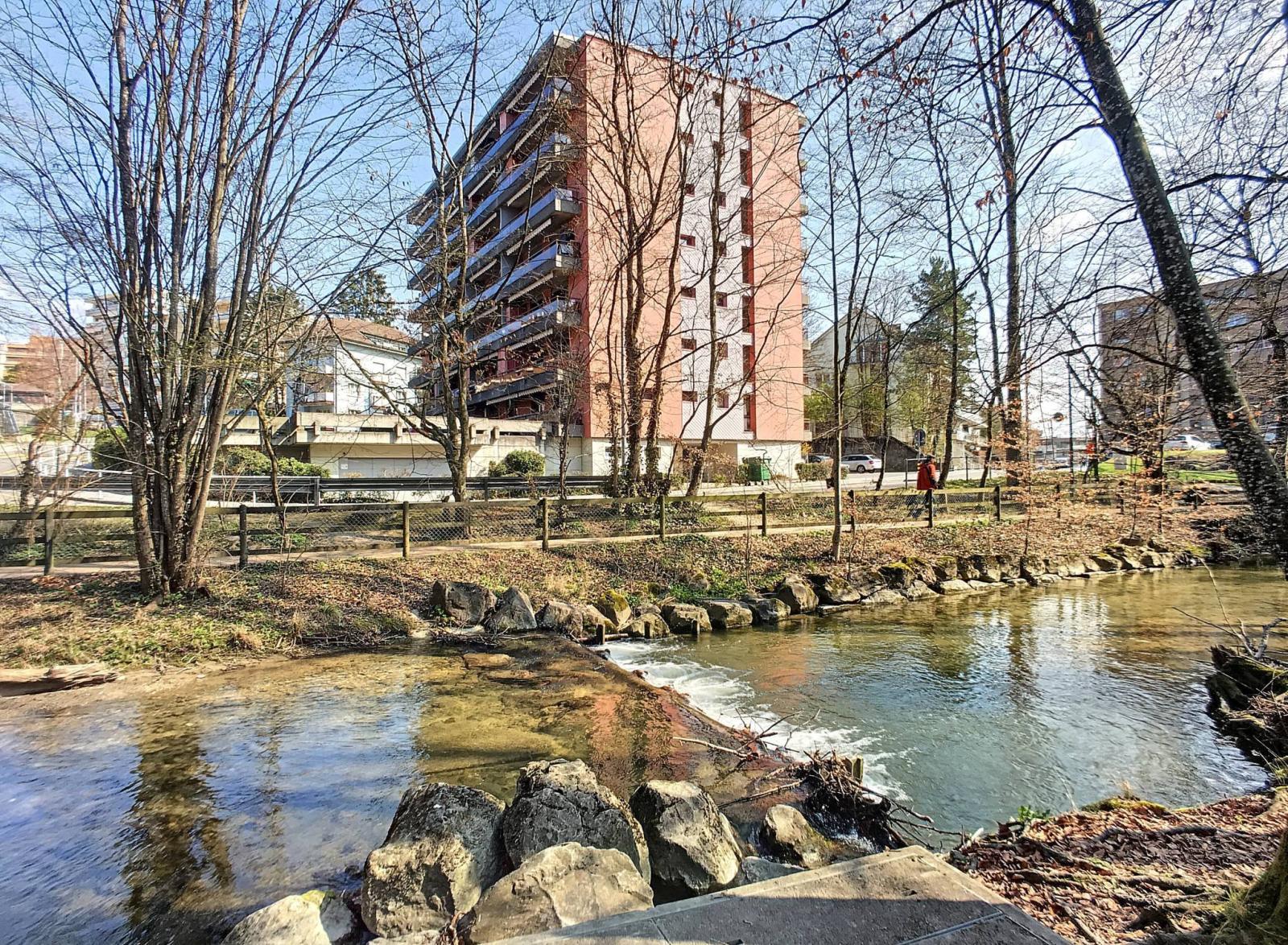 Located in a quiet and green area in the center of Morges, this building was built in 1973 and has been well maintained and regularly renovated (elevators and gas boiler in 2019). It is in the immediate vicinity of the CFF train station, the city center, schools, transport, shops and motorways.