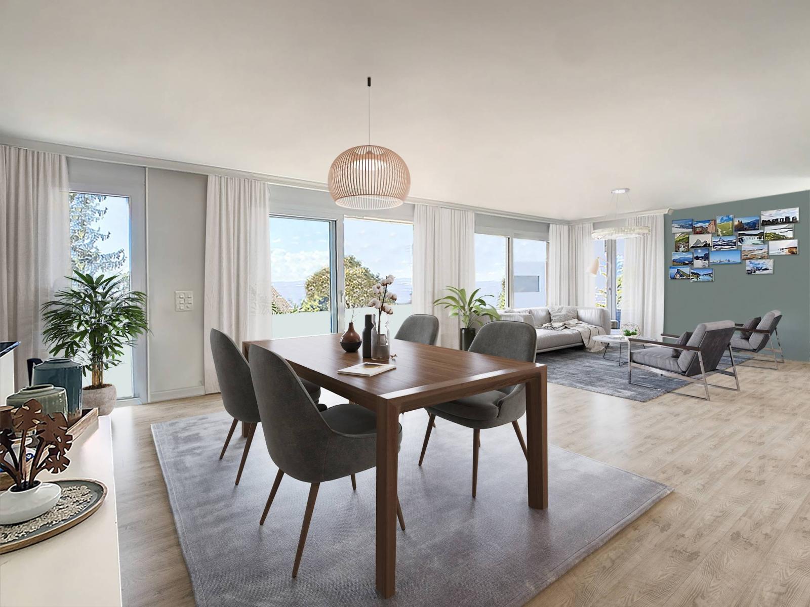 The apartment has two outdoor parking spaces, one indoor parking space and one covered parking space. All for an amount of CHF 90,000.- in addition to the sale price.