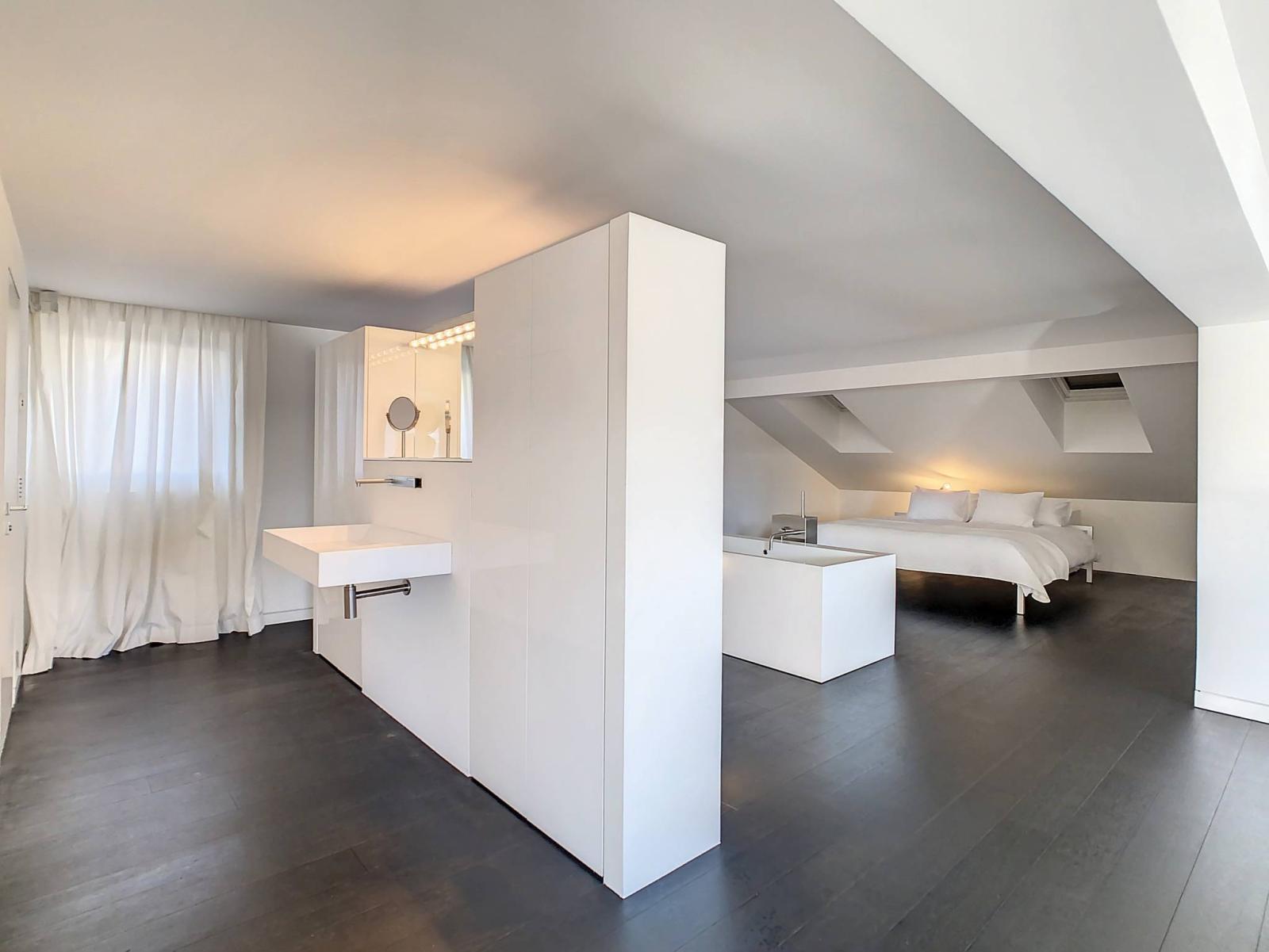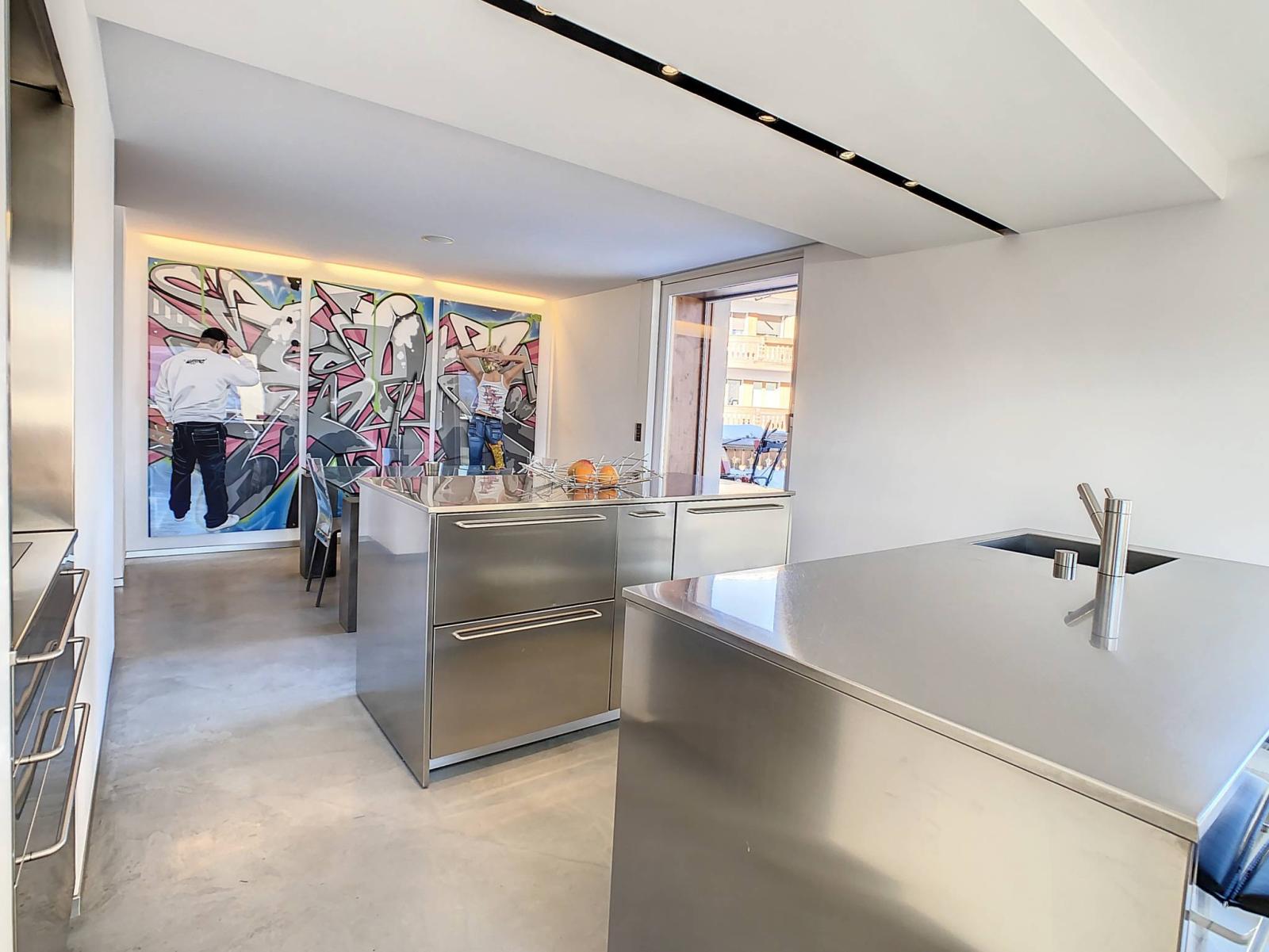 Located in the privileged Prado district, this duplex, spread over 210 m2 of living space, has been completely renovated in a contemporary style combining quality materials such as tempered glass and polished concrete.