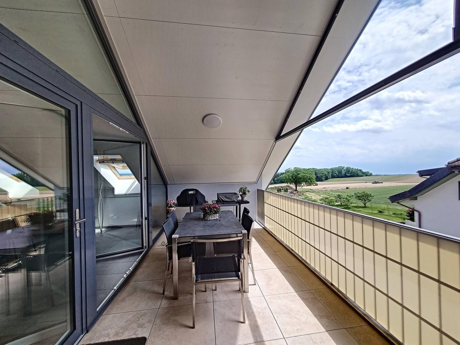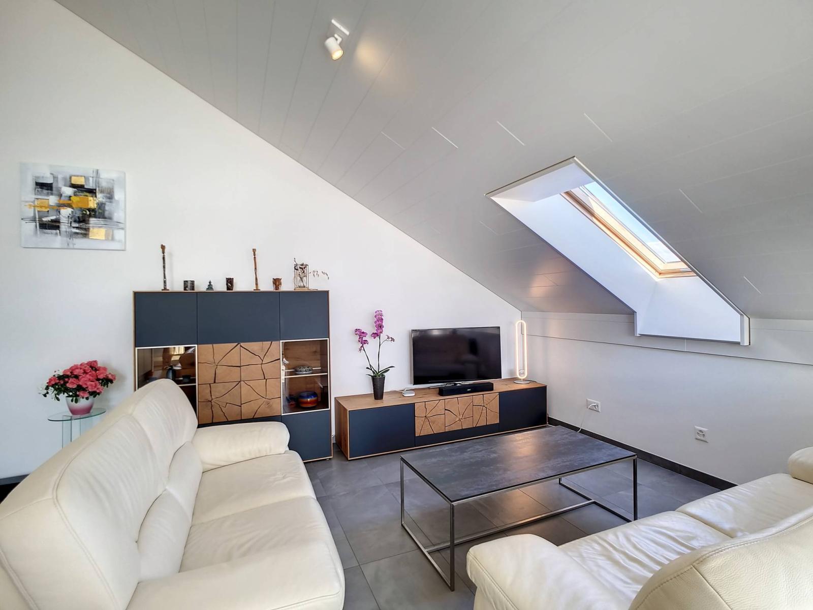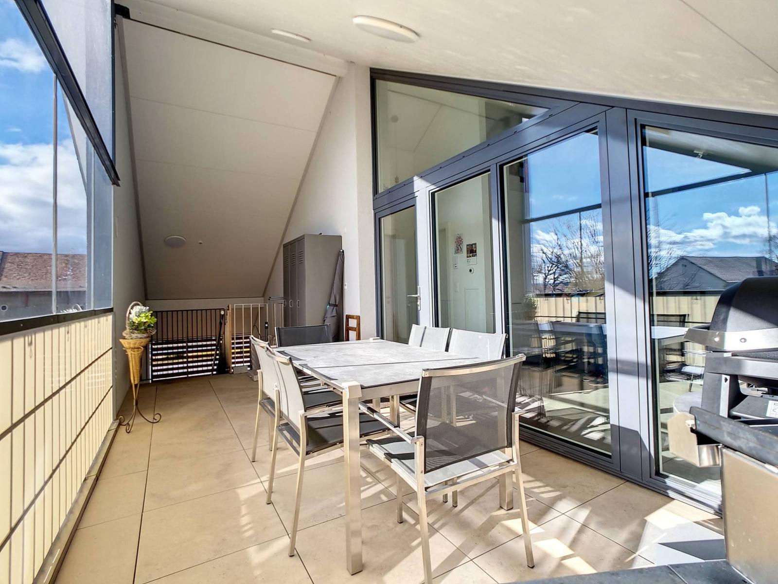 Within a human-sized building of 2 floors (lot on the top floor = no elevator), built in 2017, the PPE is presented in the form of 2 small buildings of 6 and 8 lots. The apartment is in the attic, with a large covered balcony (open loggia type) of almost 19 m²! This is organized so that it can remain "open" or "semi-closed" by removable glazing, in order to enjoy it all year round.