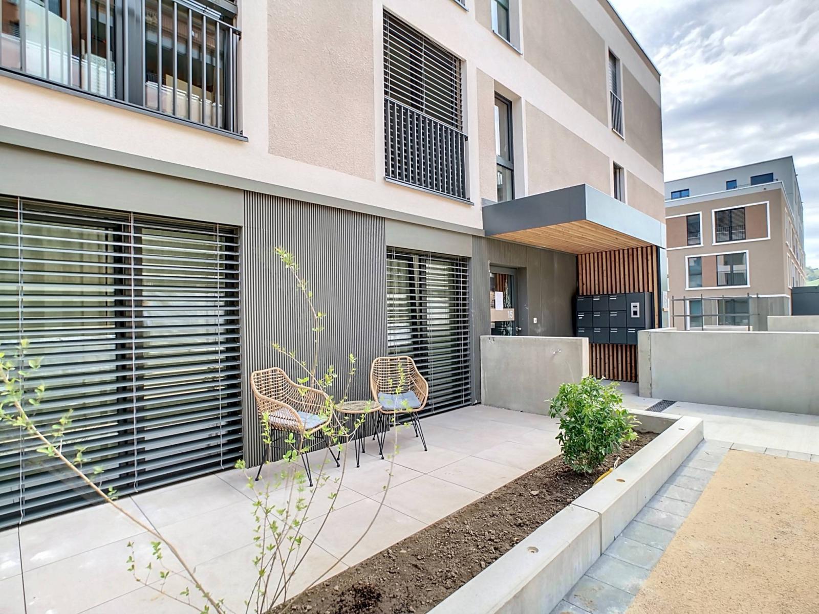 Your advantages: - Modern and high-quality interior fittings, finishes to suit the tenant - Private gardens, terraces or large balconies - Succession of grassy and tree-filled terraced areas - Wooden playground - Site fully accessible by paths and ramps - Visitor parking on the surface - Underground parking for cars, motorbikes and bicycles