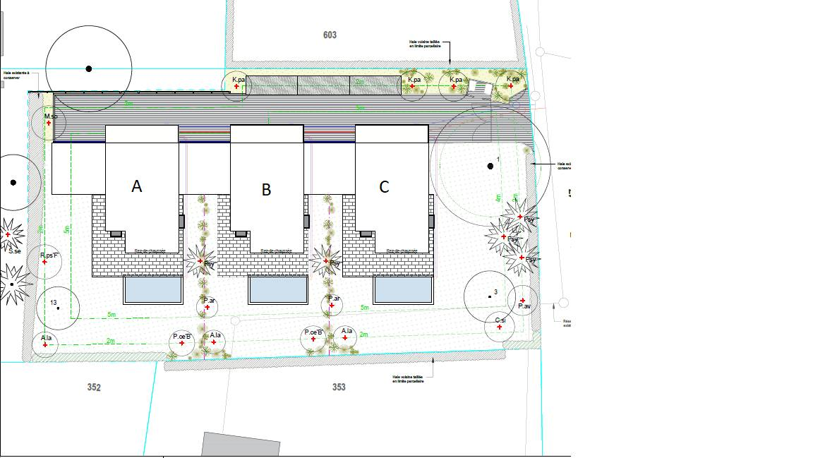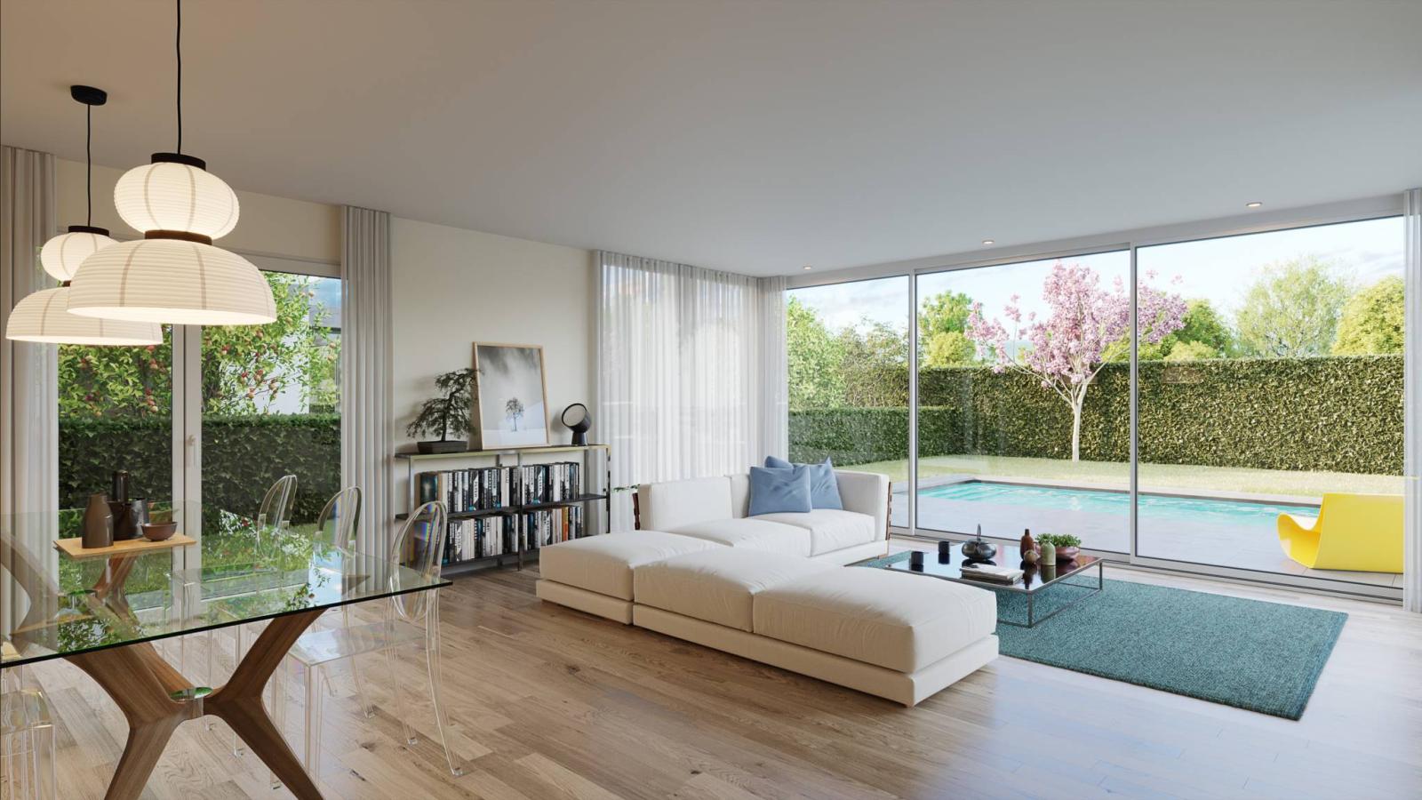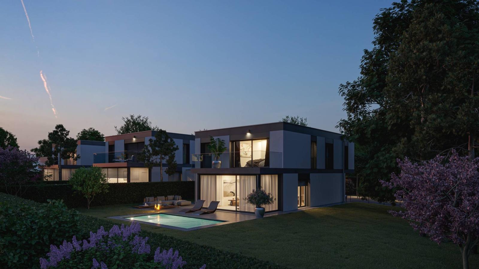 The houses, completely excavated, have heating by heat pump (air-water) and solar and photovoltaic panels. The private and fenced gardens can accommodate a swimming pool at the buyers' choice. A double garage and an outdoor space adorn each villa