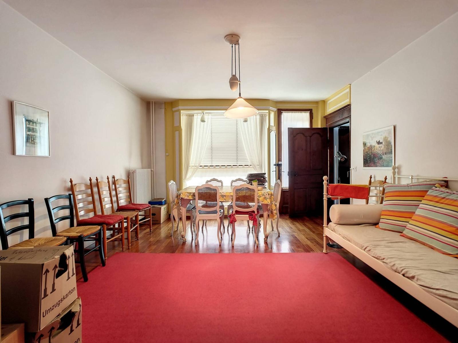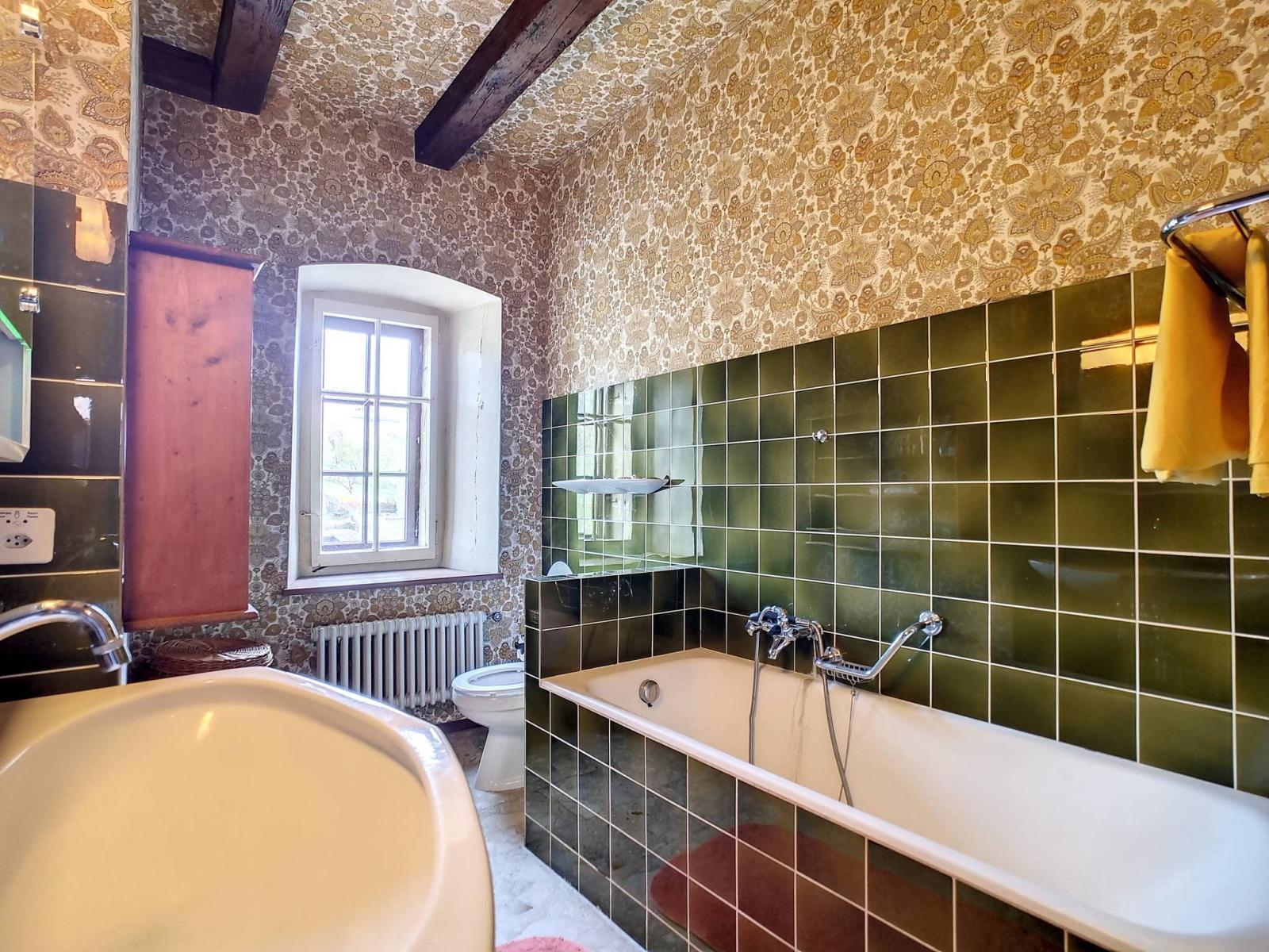 The entrance to the house is from the street side and reveals an interior layout with multiple decors such as exposed beams, old-fashioned oak or fir parquet floors, ceramic fireplace and stove, wallpaper and arched walls. Everything has been well maintained over the years but could benefit from an update and a general refresh.
