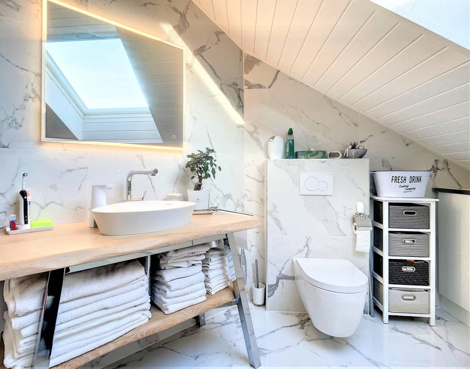Upstairs you will find 3 bedrooms with a bathroom and toilet. The master bedroom has its own bathroom, walk-in shower, bathtub and toilet.