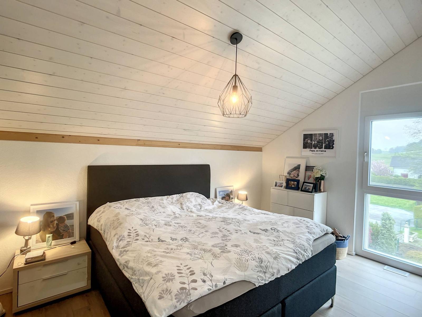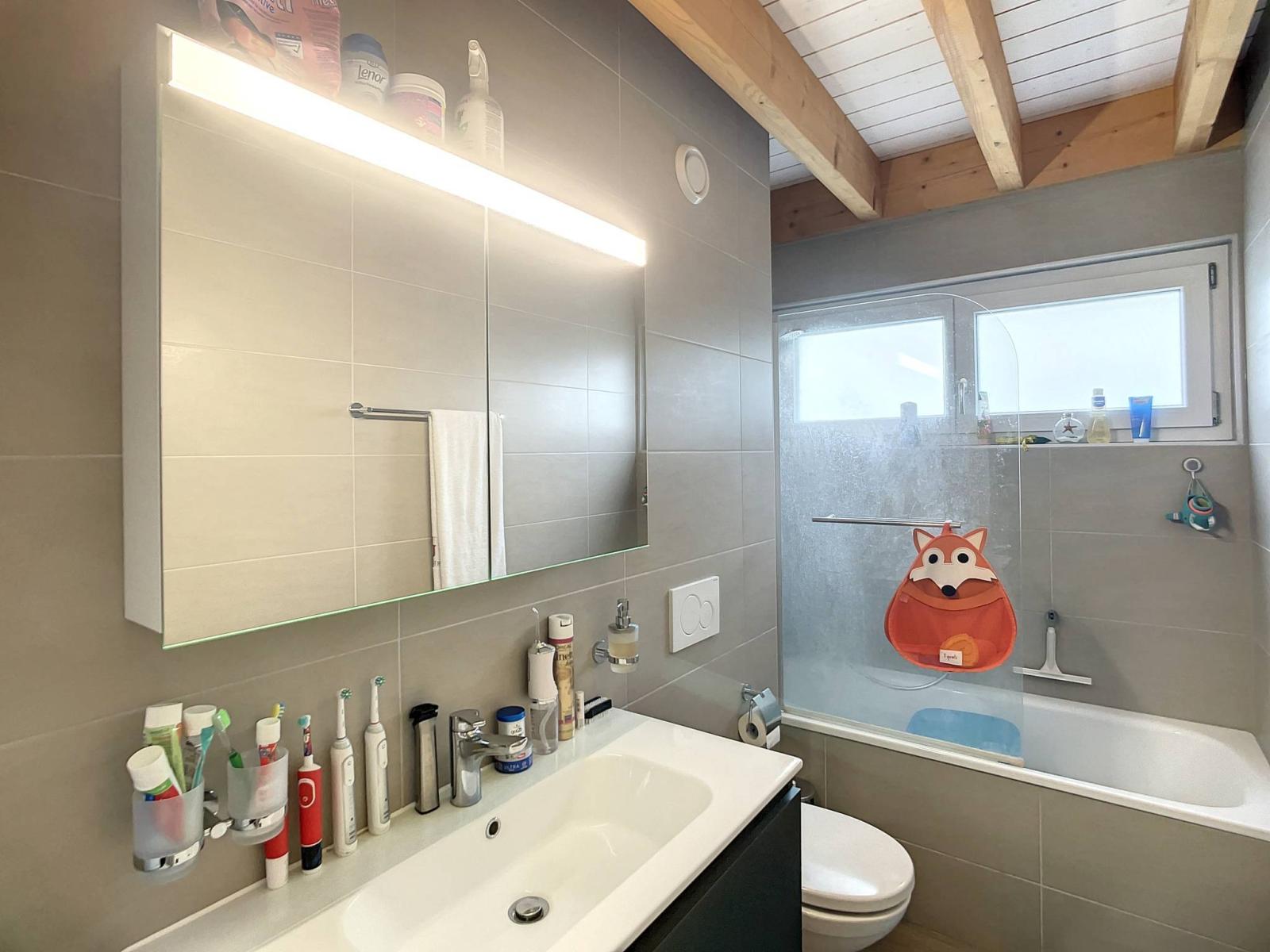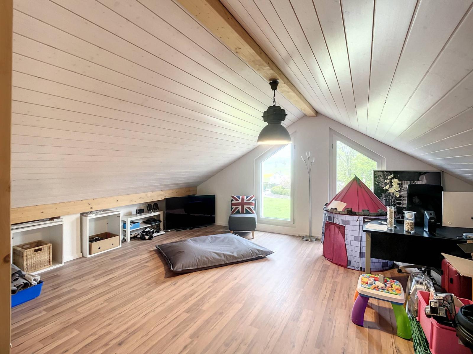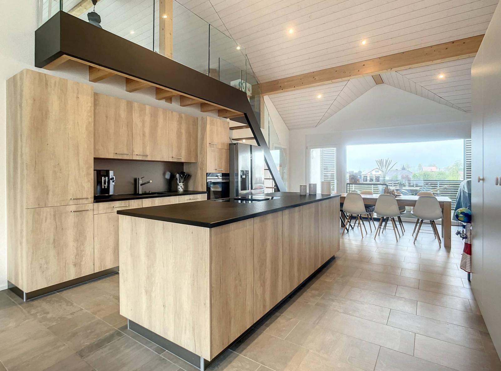 Modern in design with beautiful finishes, you will particularly appreciate its 51 m² living room and its open kitchen with central island, its master bedroom with private shower room, its mezzanine of more than 21 m² or its balcony from which you can enjoy the view of the Fribourg pre-Alps.