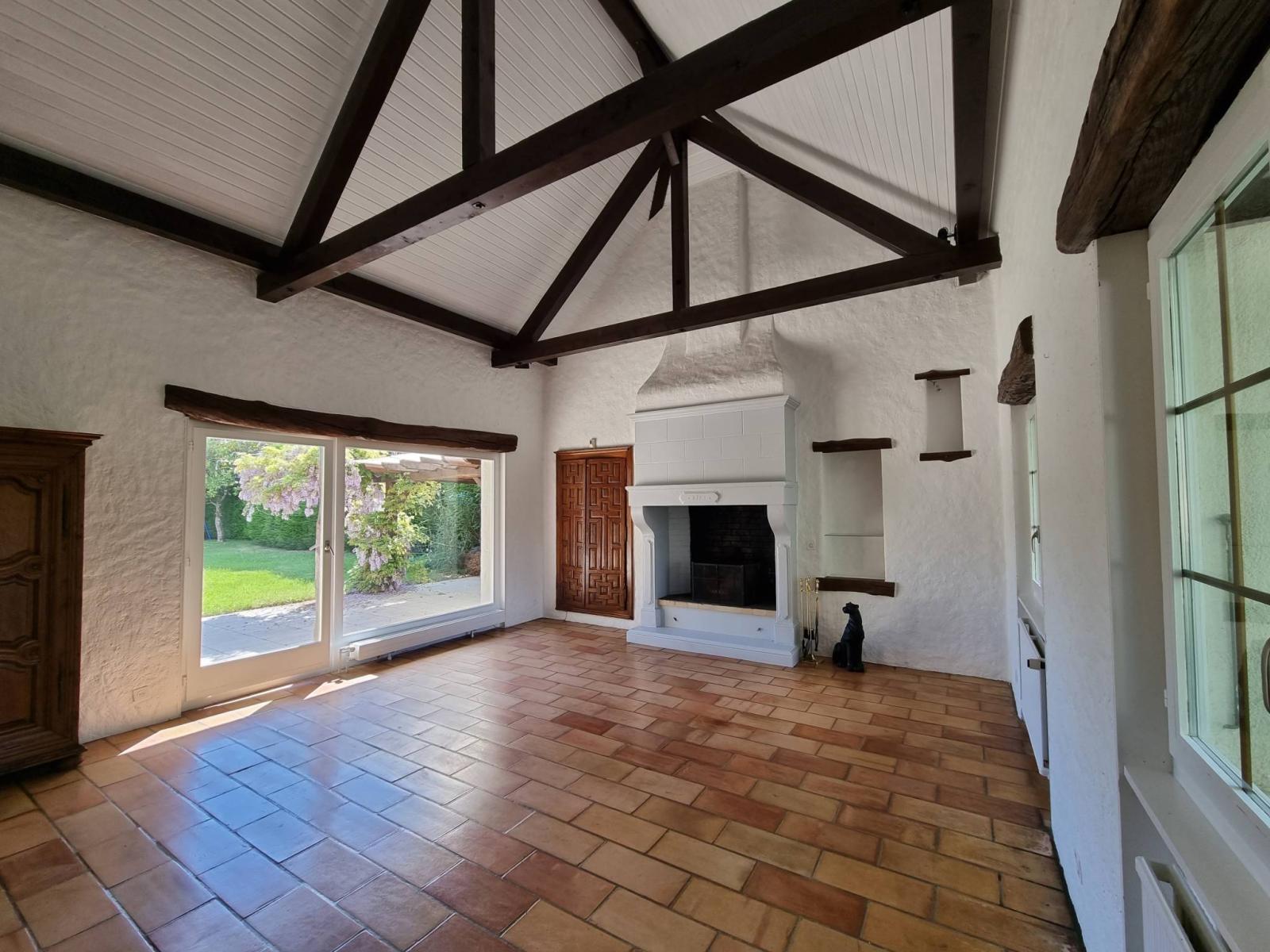 The living room is a centerpiece of the home, with a height of 5.5 meters under the ridge and a pretty view of the wooded garden.
