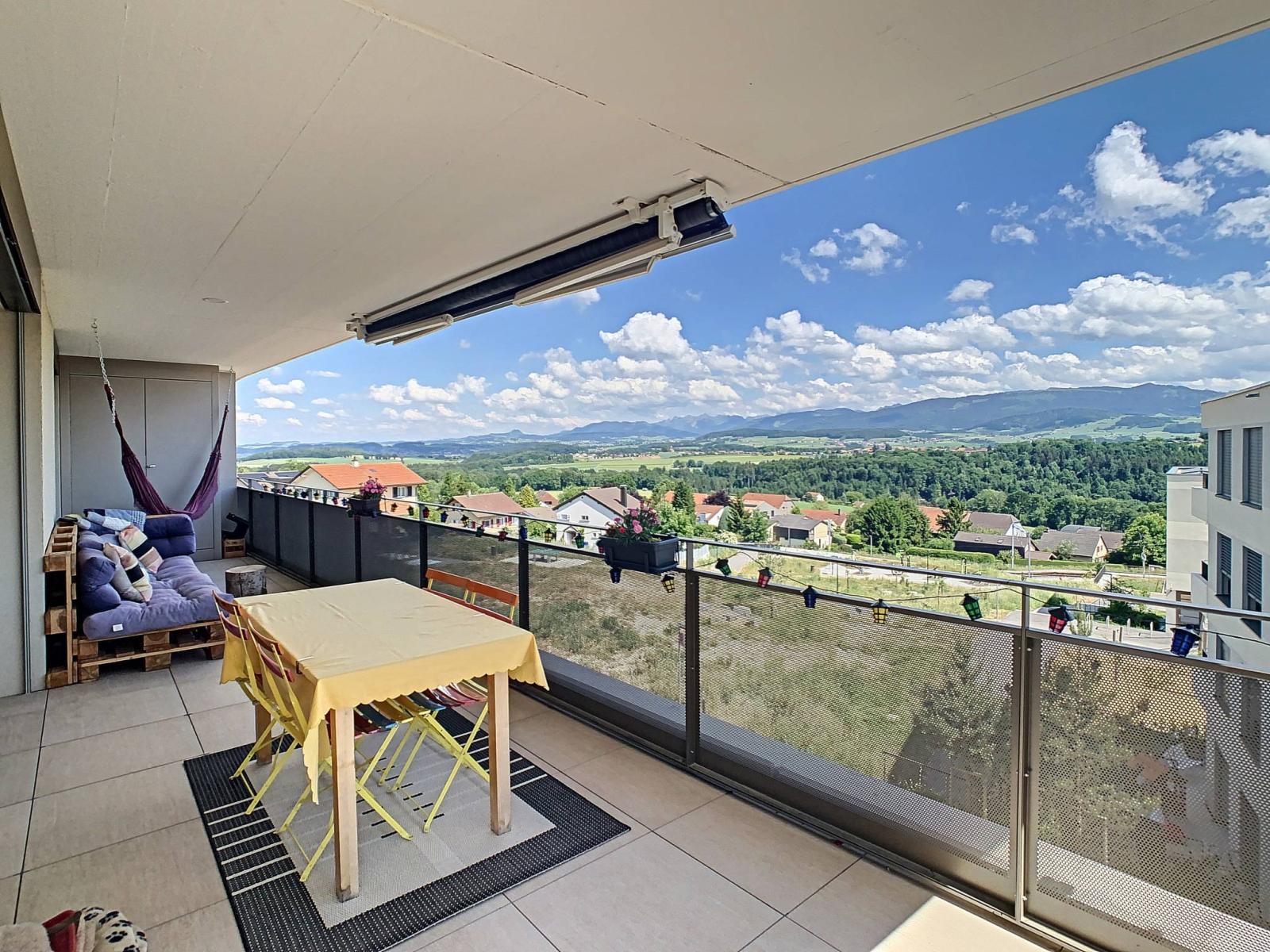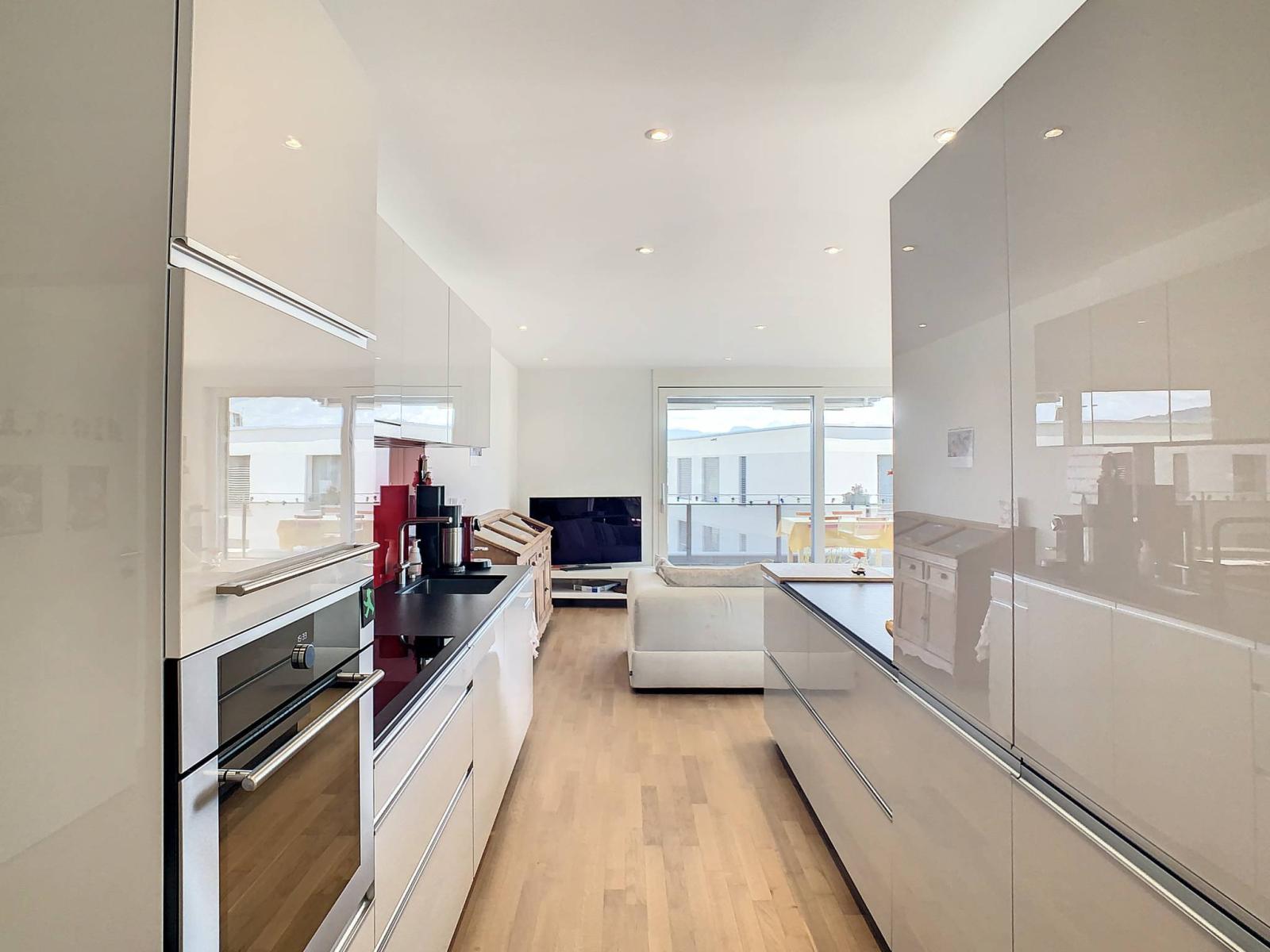 This spacious 4.5 room apartment, located on the 2nd floor of a PPE building with 8 apartments built in 2019, has a total living area of 107.2 m², supplemented by a 28.2 m² balcony, bringing the weighted surface area to 123.3 m2.