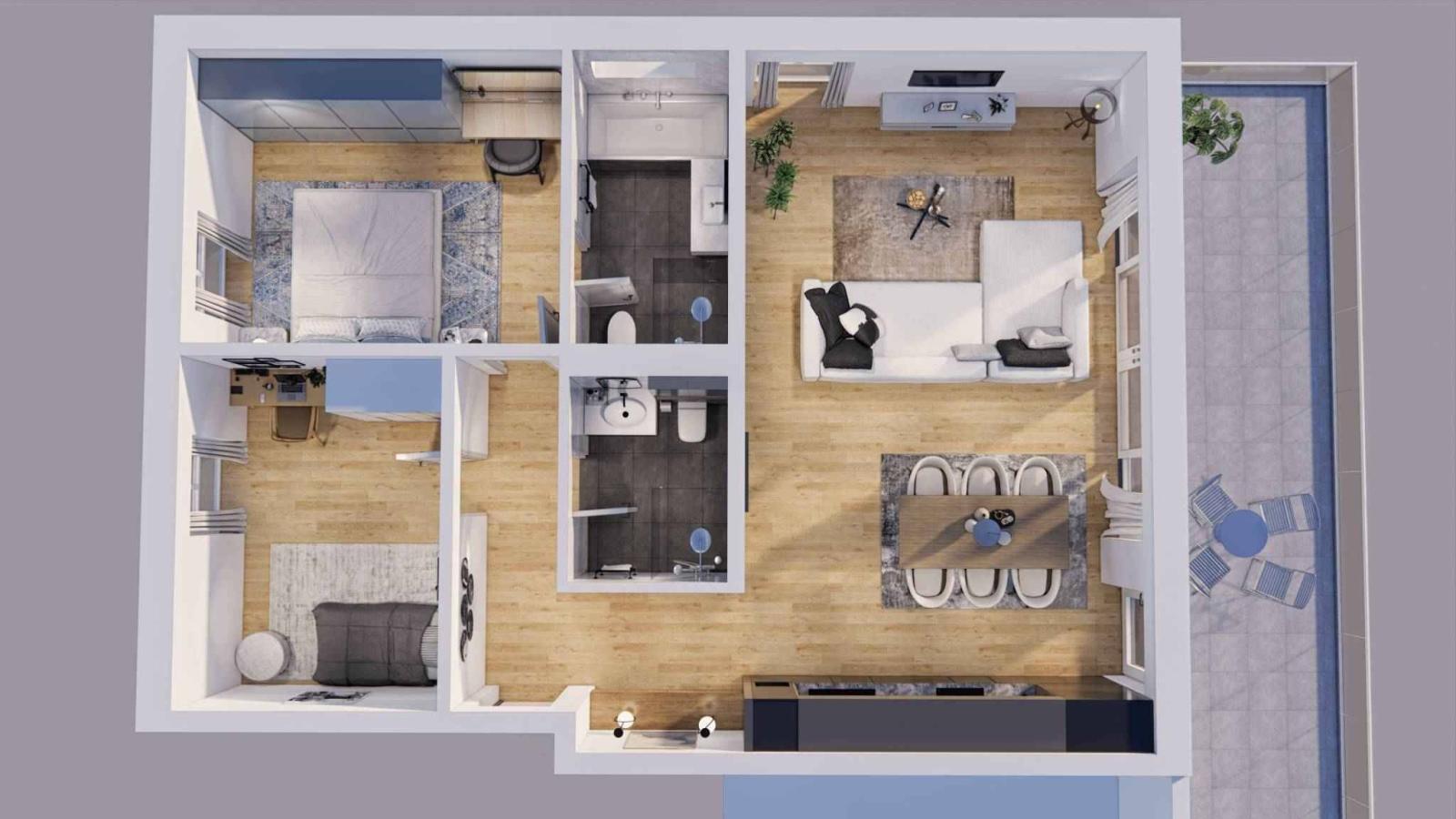 The apartments in this project, ranging from 3.5 to 5.5 rooms, all benefit from large balconies or terraces for the ground floor and attic accommodations.