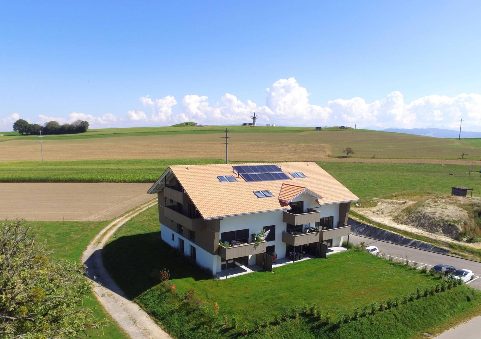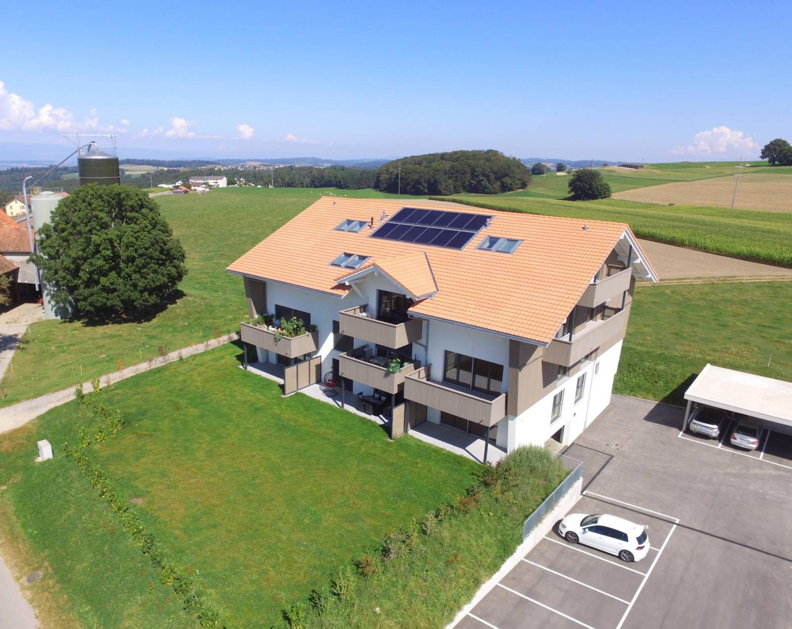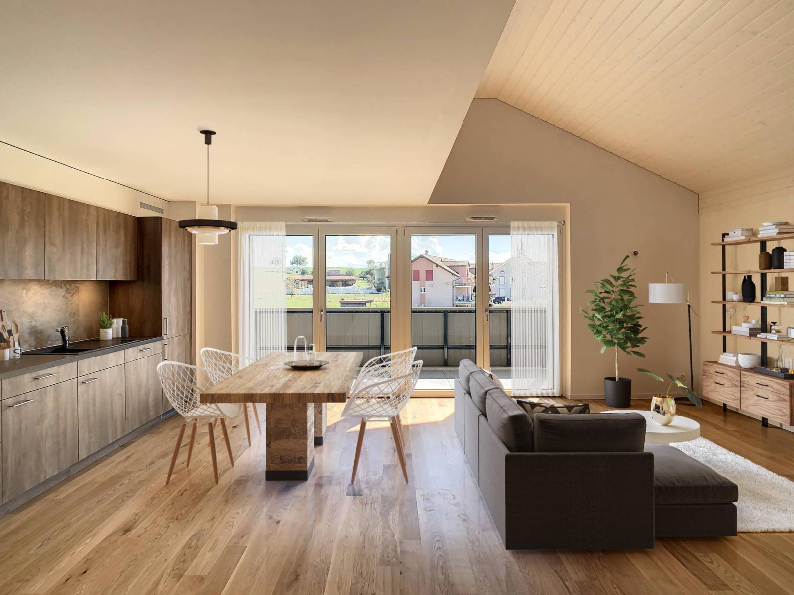 Ideally located between Fribourg and Payerne, this new 3.5 room apartment, located precisely in the Village of Middes, has a living area of 103 m² and a balcony of 14 m², thus totaling a weighted surface area of approximately 110 m². It offers an idyllic living environment combining the proximity of the 2 cities while benefiting from a green environment, on the edge of an agricultural area.