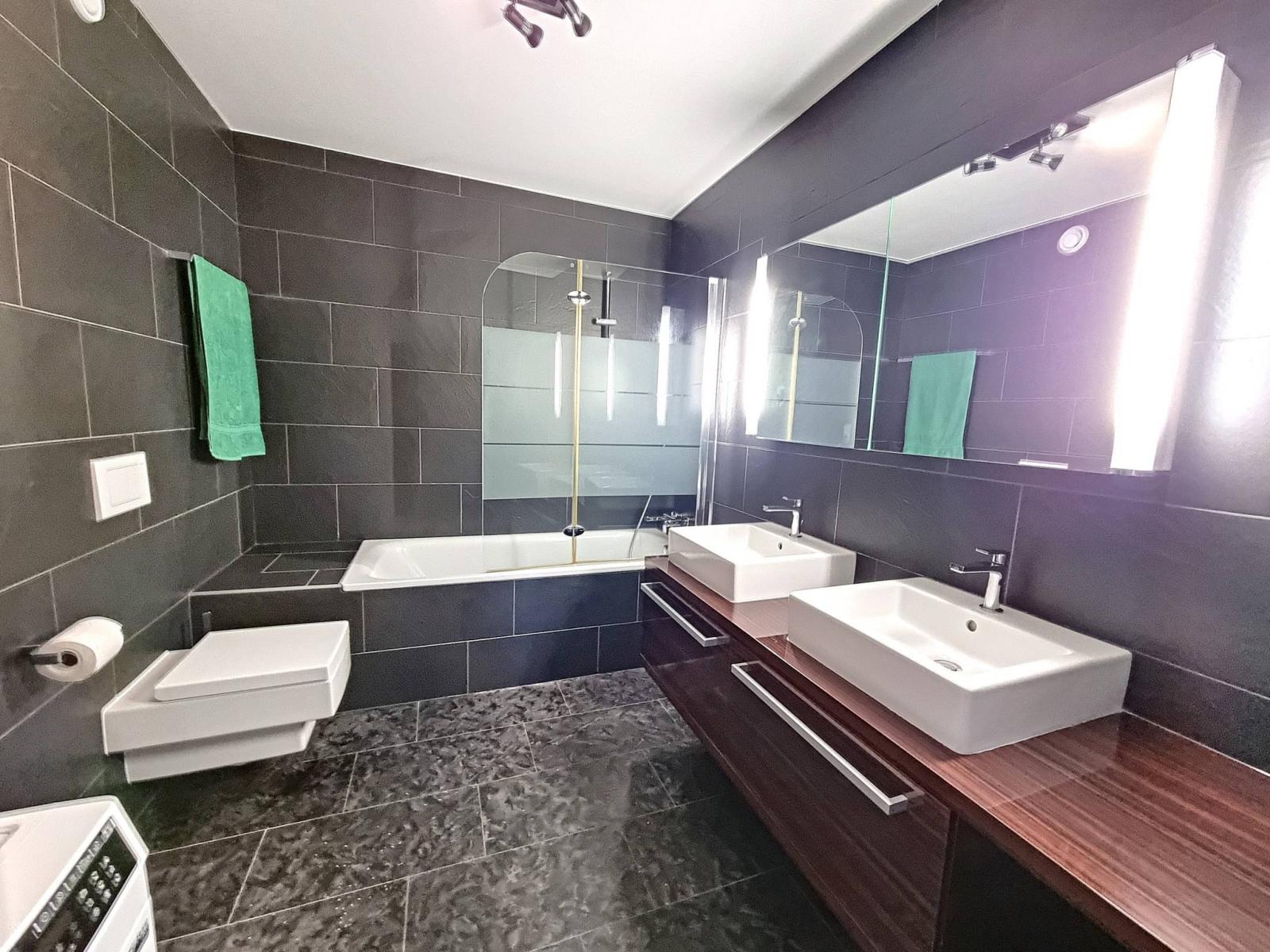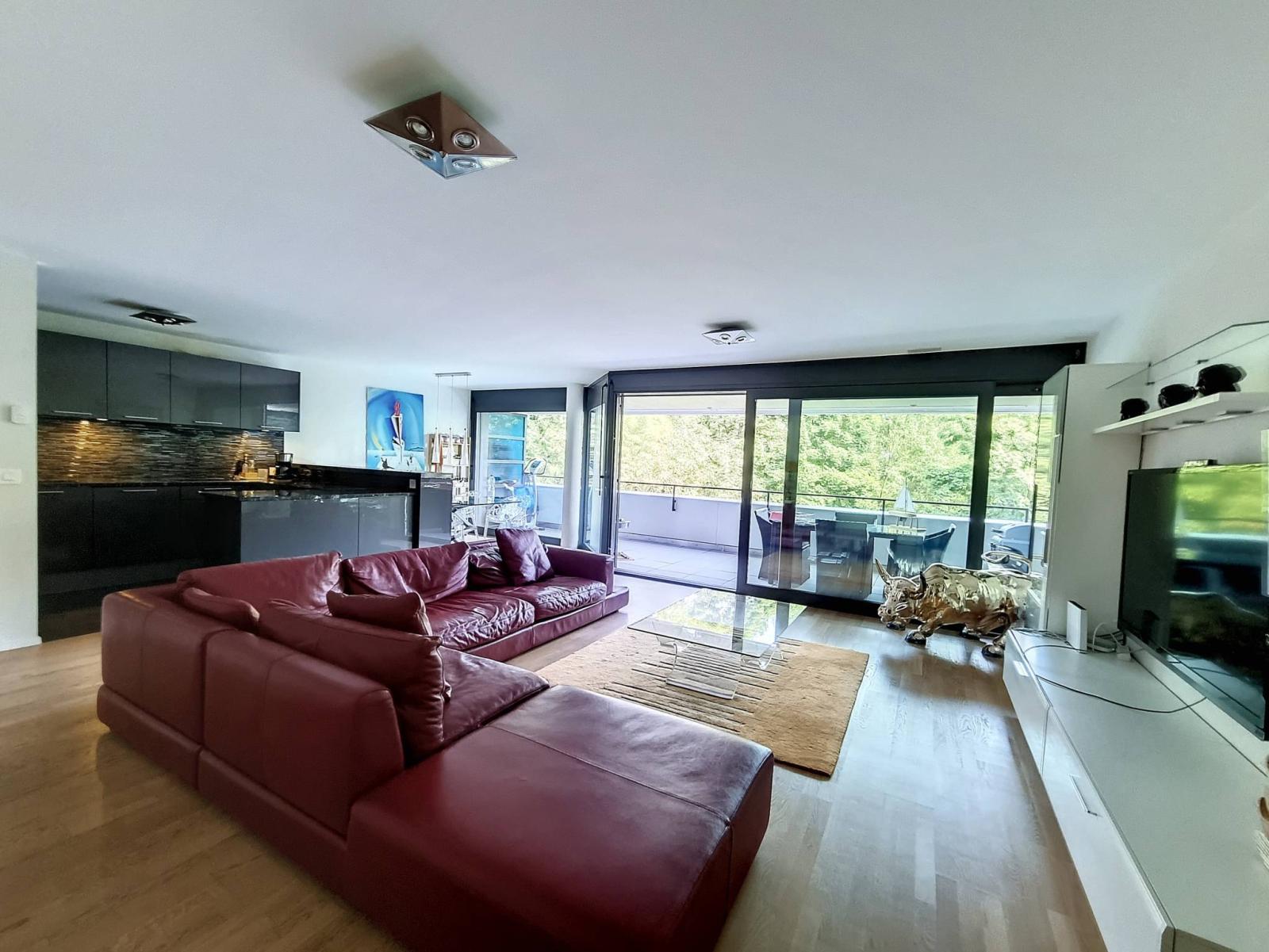 We have the advantage of presenting this 4.5 room apartment of 112.6 m² of living space, offering three bedrooms including a master with bathroom (existing washing machine connection) and a custom-made wardrobe with mirrors. It also has an entrance hall with cupboards, a spacious and bright living room/luxury kitchen of approximately 47 m² benefiting from bay windows giving access to a terrace with no vis-à-vis other than the greenery. The finishes are first class (luxury kitchen with granite worktop, AEG vitroceramic equipment, siding splashback, etc.).