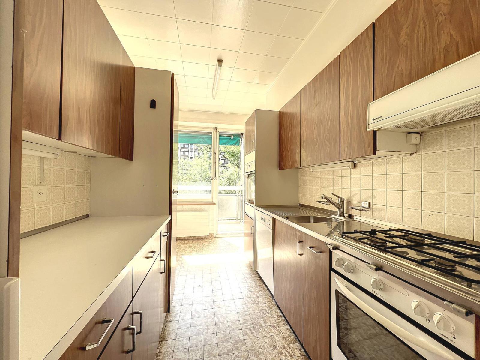 The living area consists of a generous entrance hall with a cloakroom, a large living room opening onto a loggia and a closed kitchen with dining area and access to the loggia.