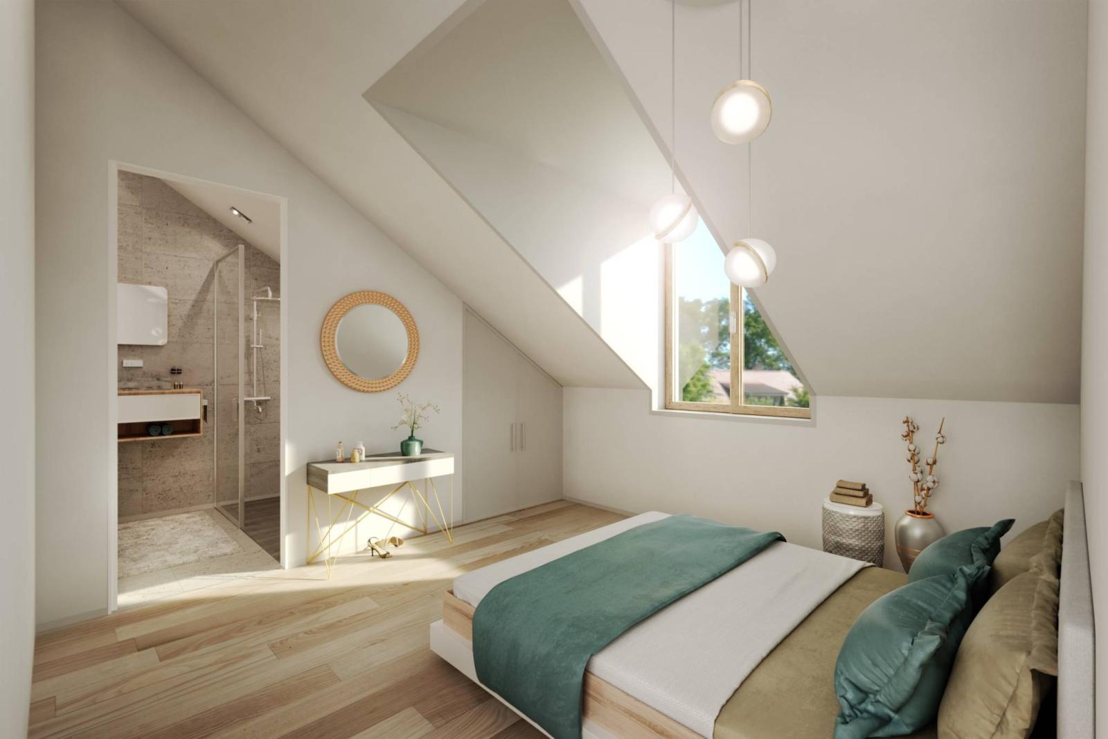 On the first and last floors of a new village residence located in Jussy, in the heart of the charming hamlet of Lullier, superb 6-room duplex with large west-facing balcony and view of the gardens.