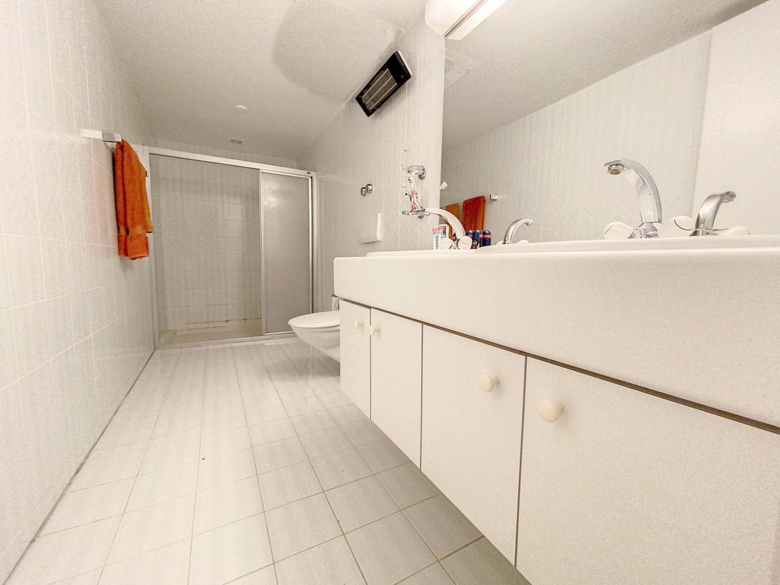 The living room with its fireplace is spacious and gives access to the balcony. The kitchen and one of the bedrooms have access to the terrace on the upper ground floor, while three other bedrooms have access to the terrace on the lower ground floor.