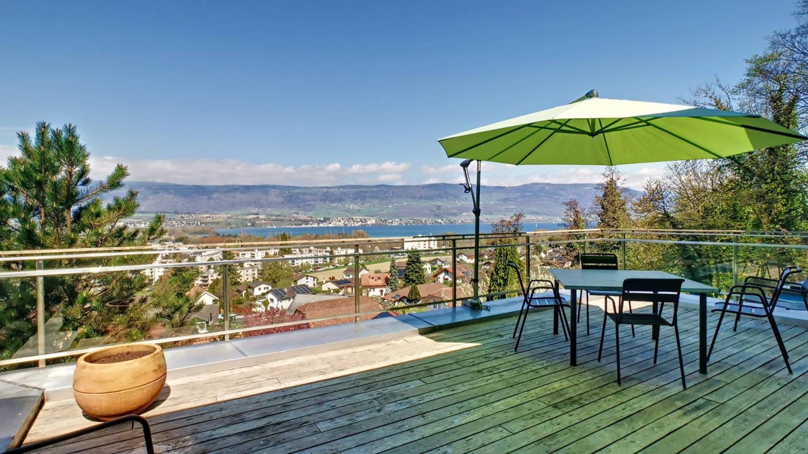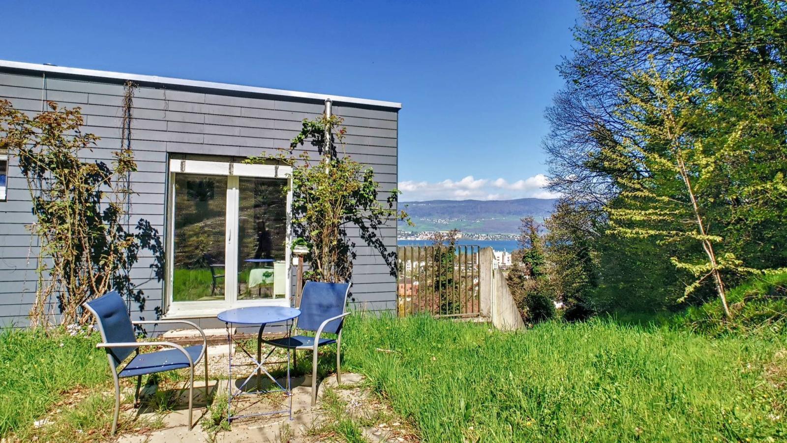 This pleasant property, in a contemporary style, is ideally located in a residential area and close to the city center of Yverdon-les-Bains and all its amenities. Located on a dominant plot of 750 m², it enjoys a green setting on the edge of the forest, quiet and not overlooked.