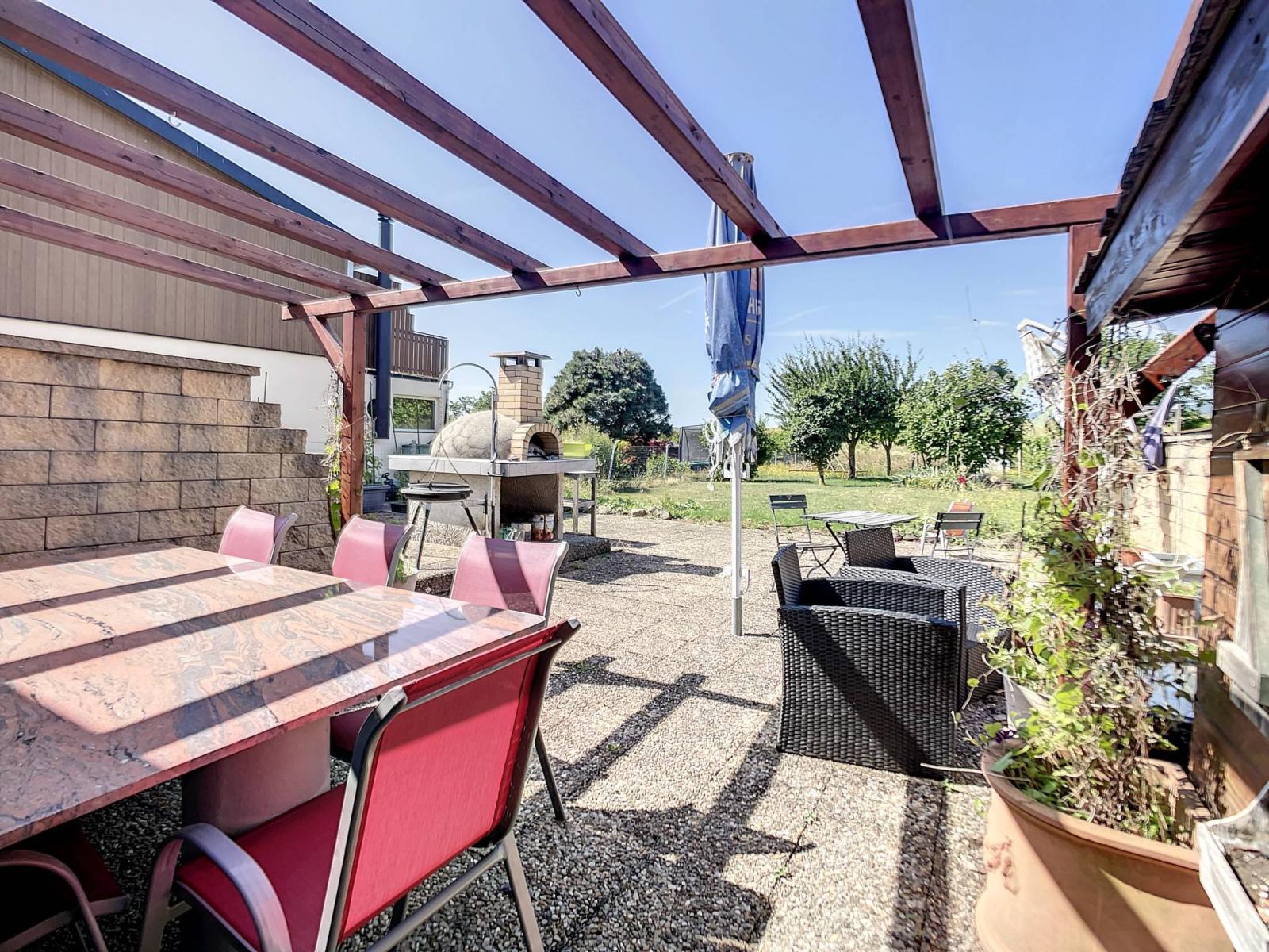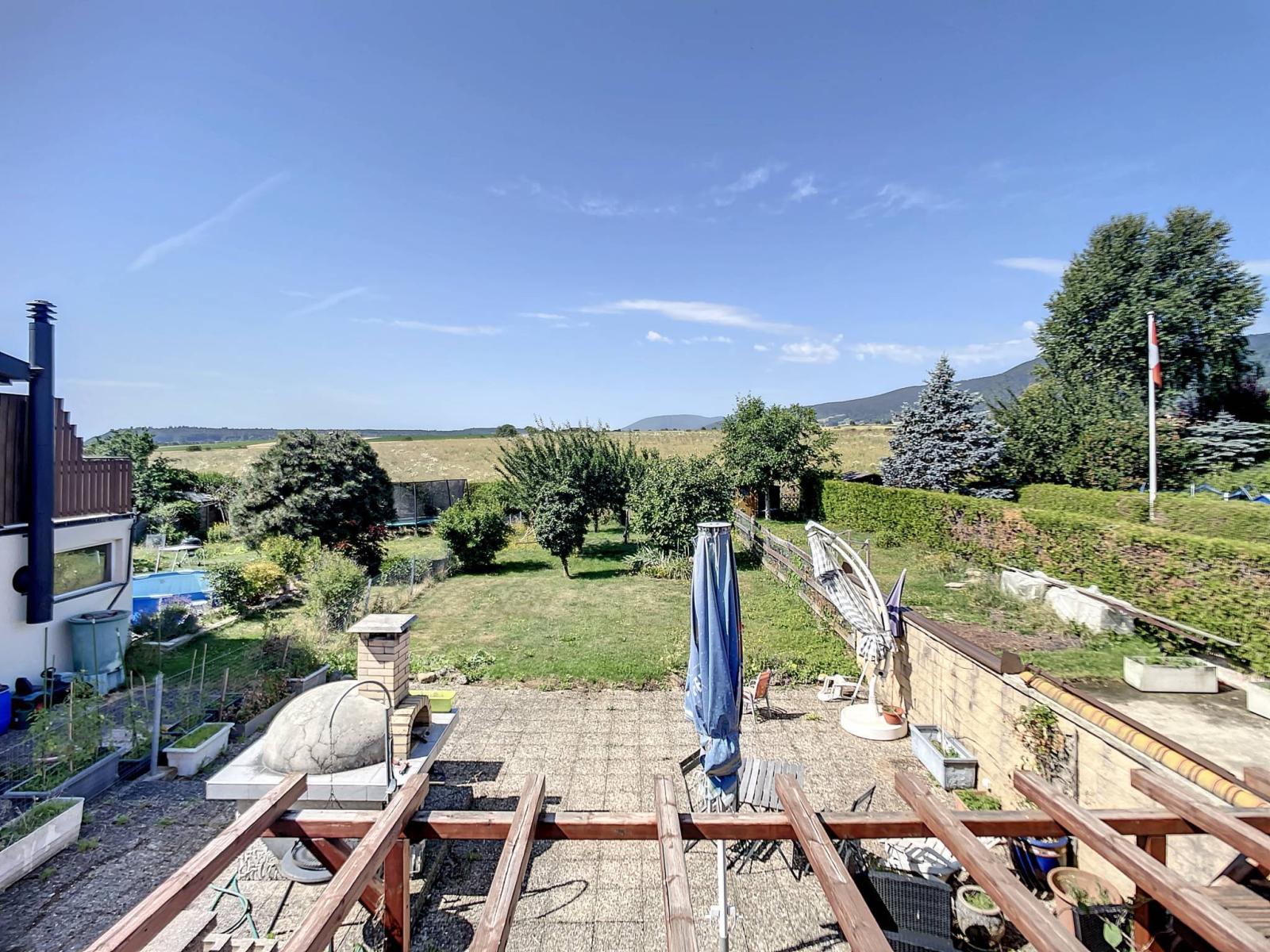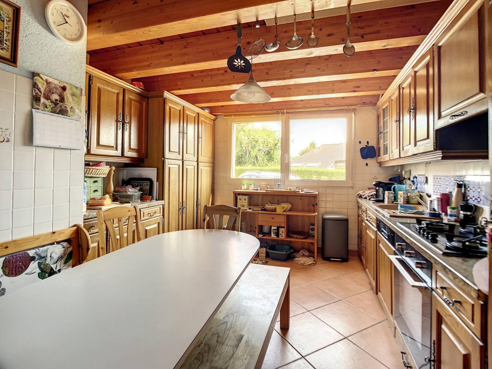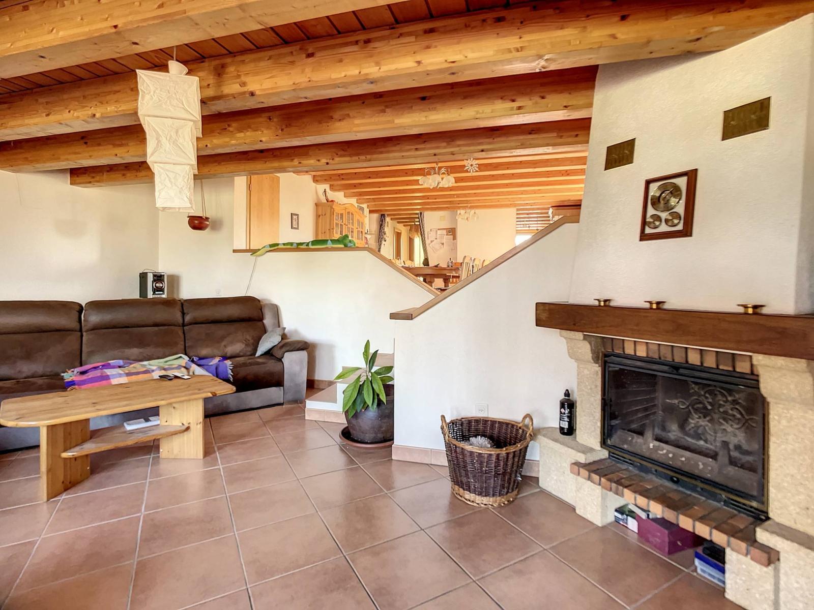 This house has a living room with fireplace, a dining area, a kitchen with the possibility of opening it, 2 bedrooms, a bathroom with WC, a separate WC as well as 4 parking spaces and the right to use the spacious PC shelter in the collective underground car park.