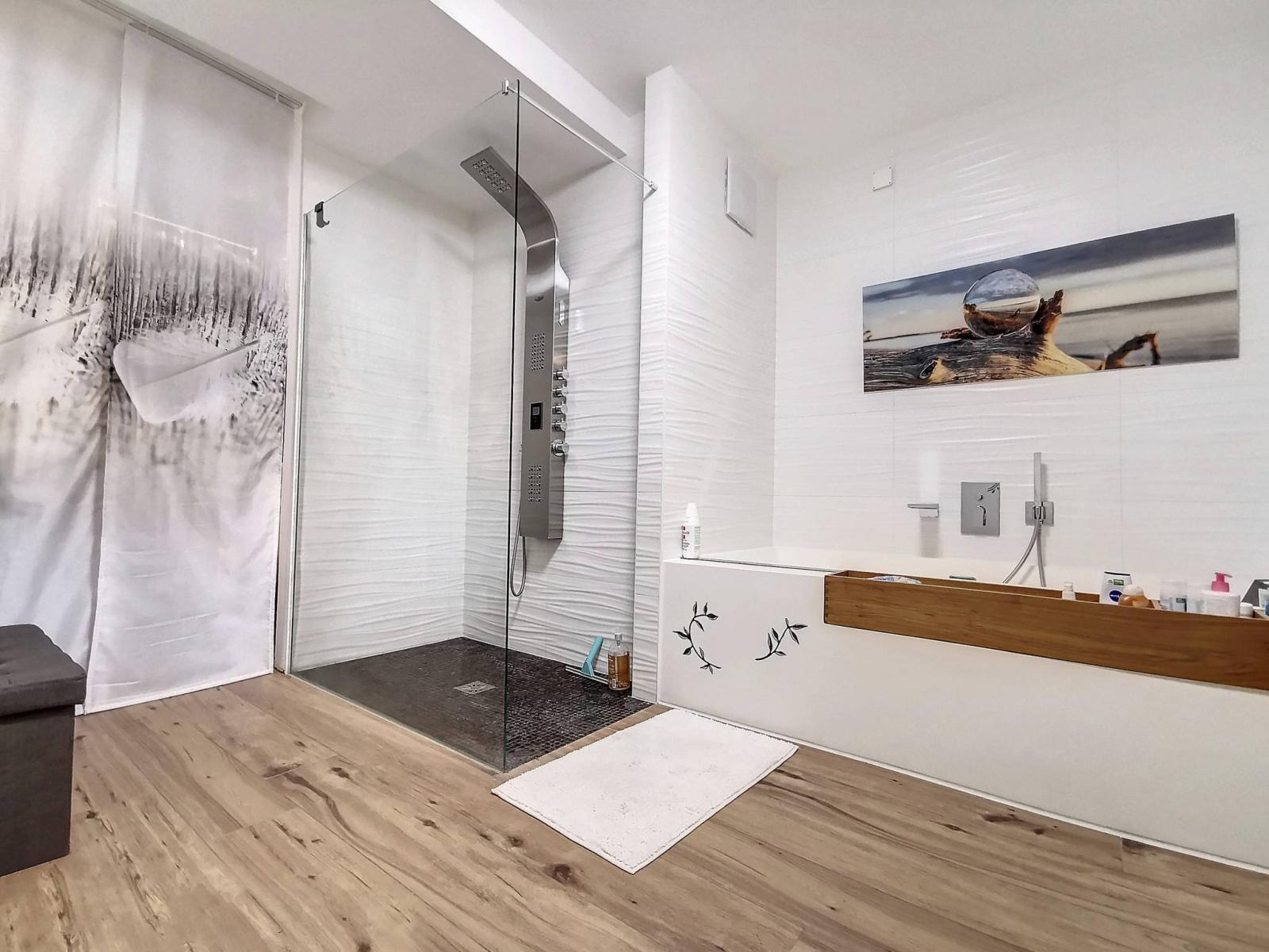 This 3.5-room apartment, with a weighted surface of approximately 164 m², is located on the upper ground floor and features a spacious living room, an open-plan fitted kitchen, two bedrooms each with their own en-suite bathroom, and a terrace of approximately 58 m² with a beautiful landscaped garden of about 175 m², elevated about 3 meters above the quay, thus ensuring your privacy and shielding you from potential disturbances or overlooking.