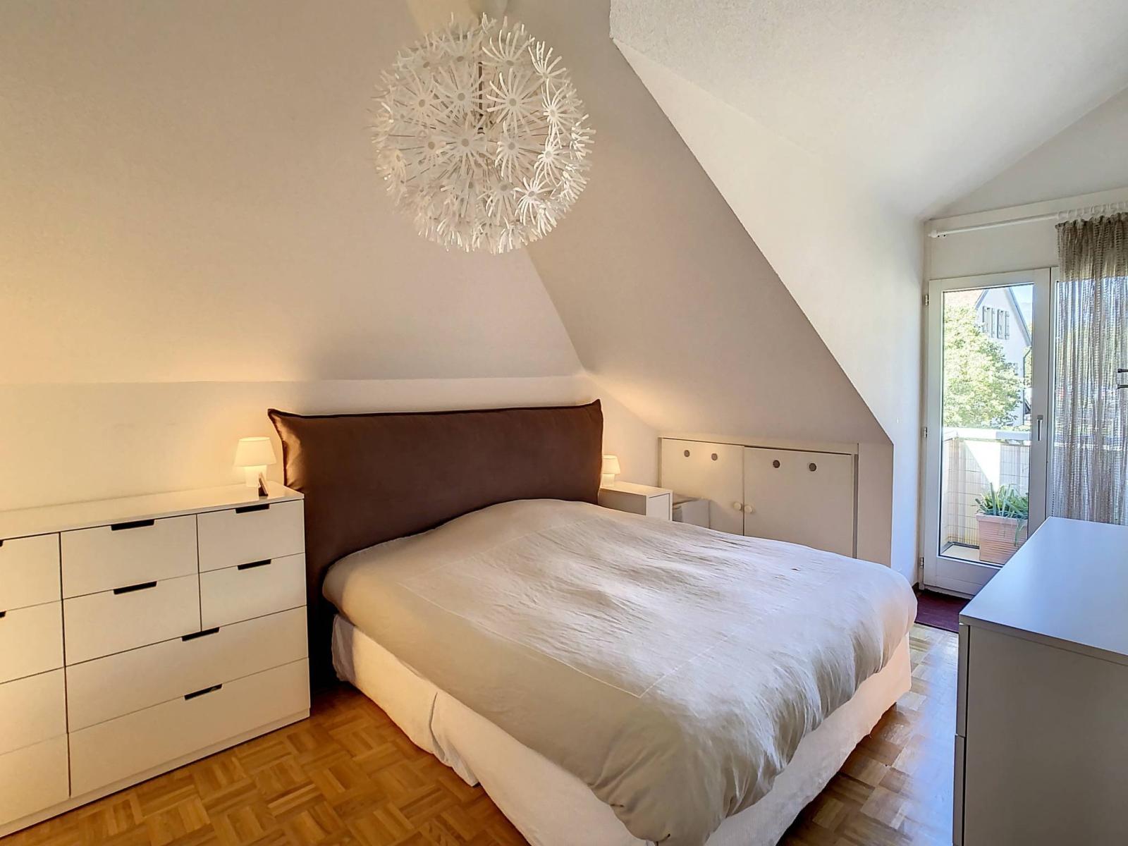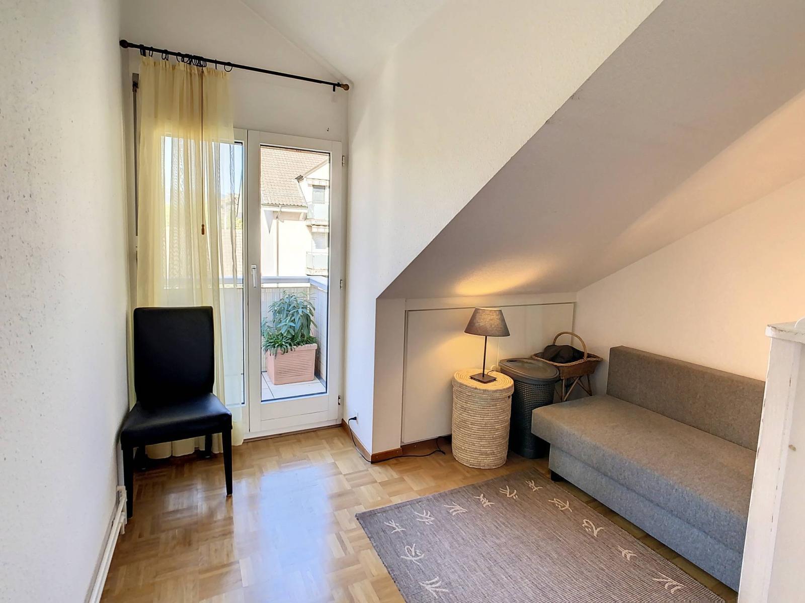 The night area offers a bathroom (renovated), a bedroom and a small bedroom with storage in the eaves. A second balcony on the Jura side is accessible from these two rooms.