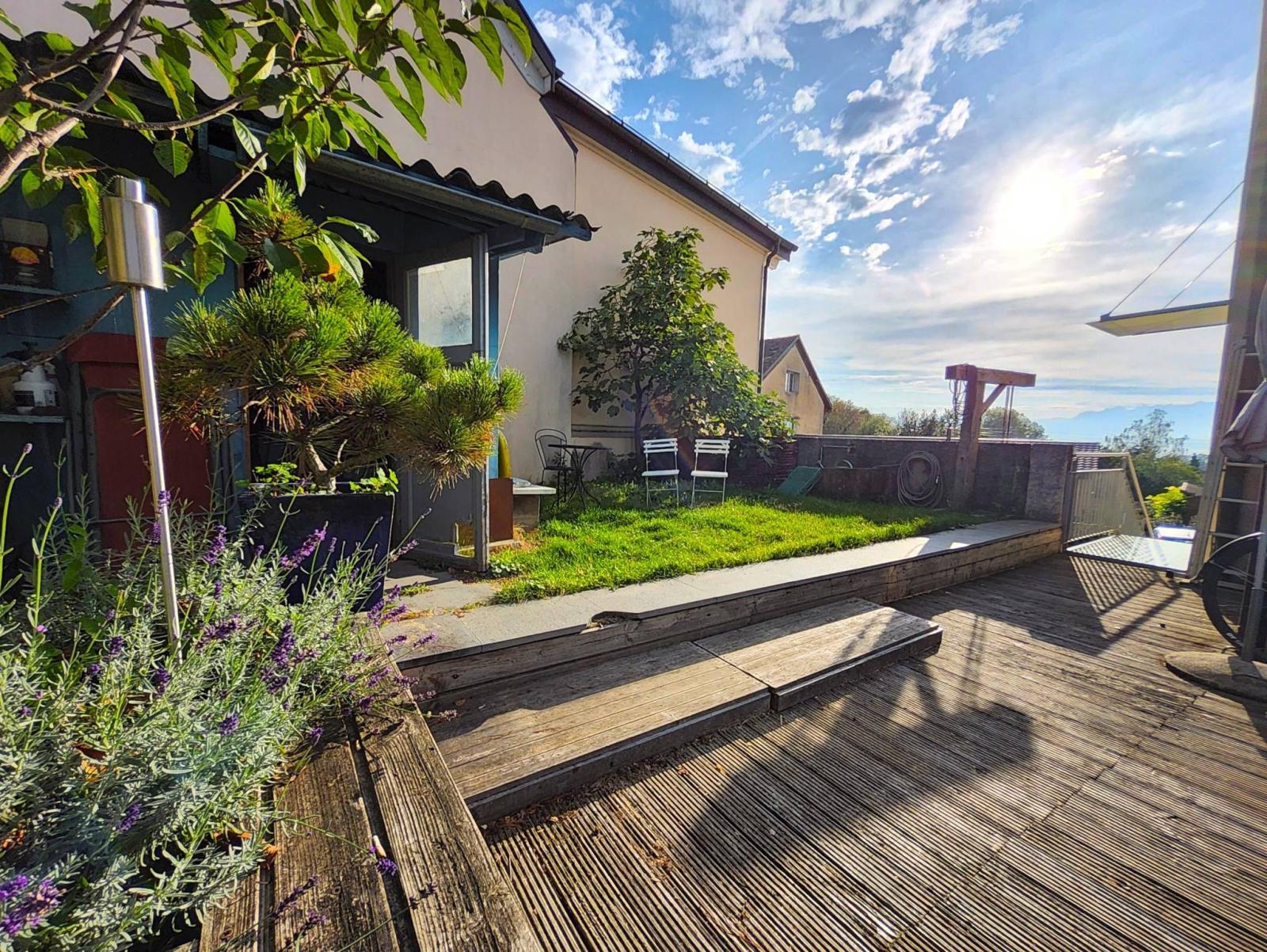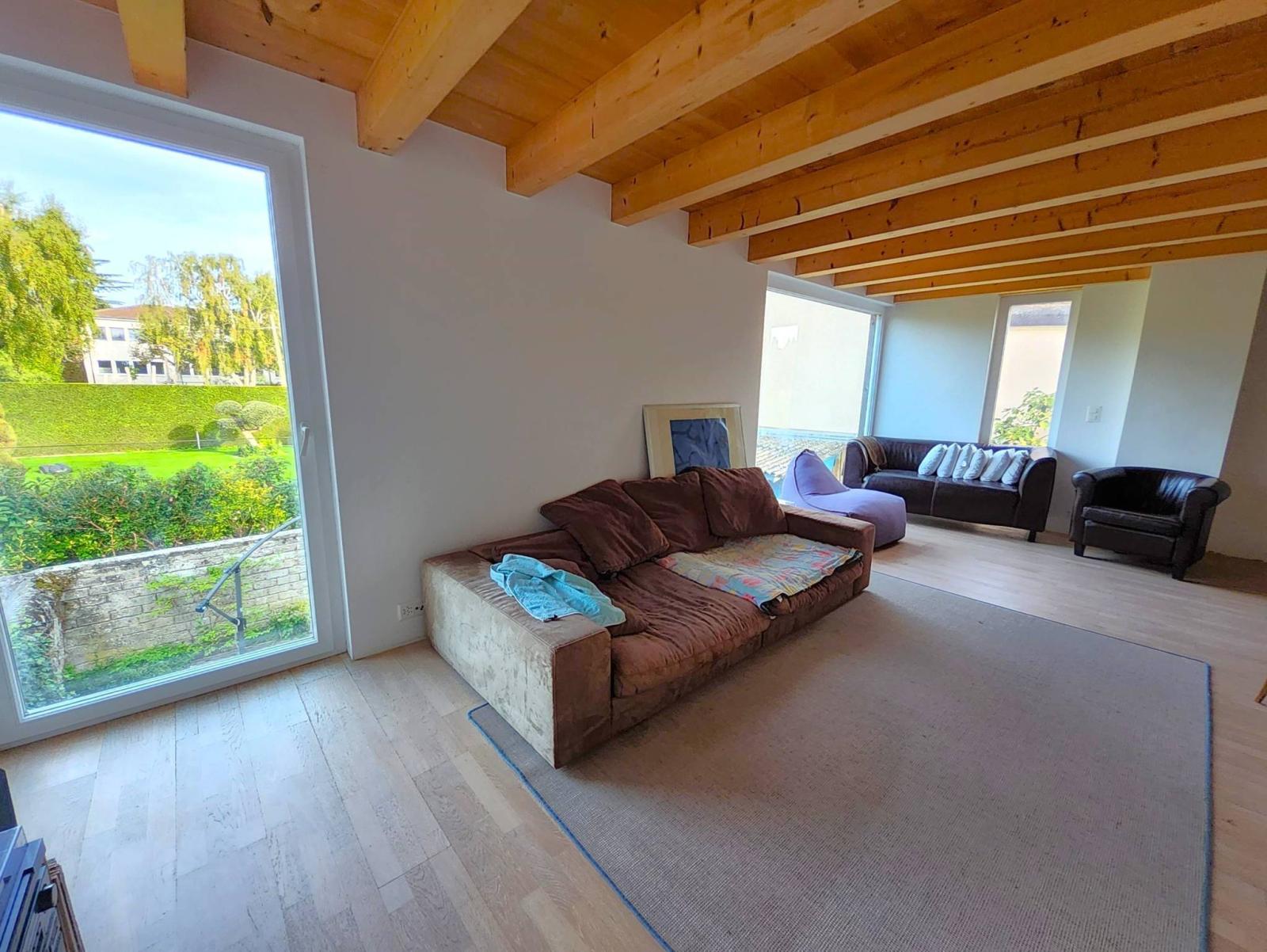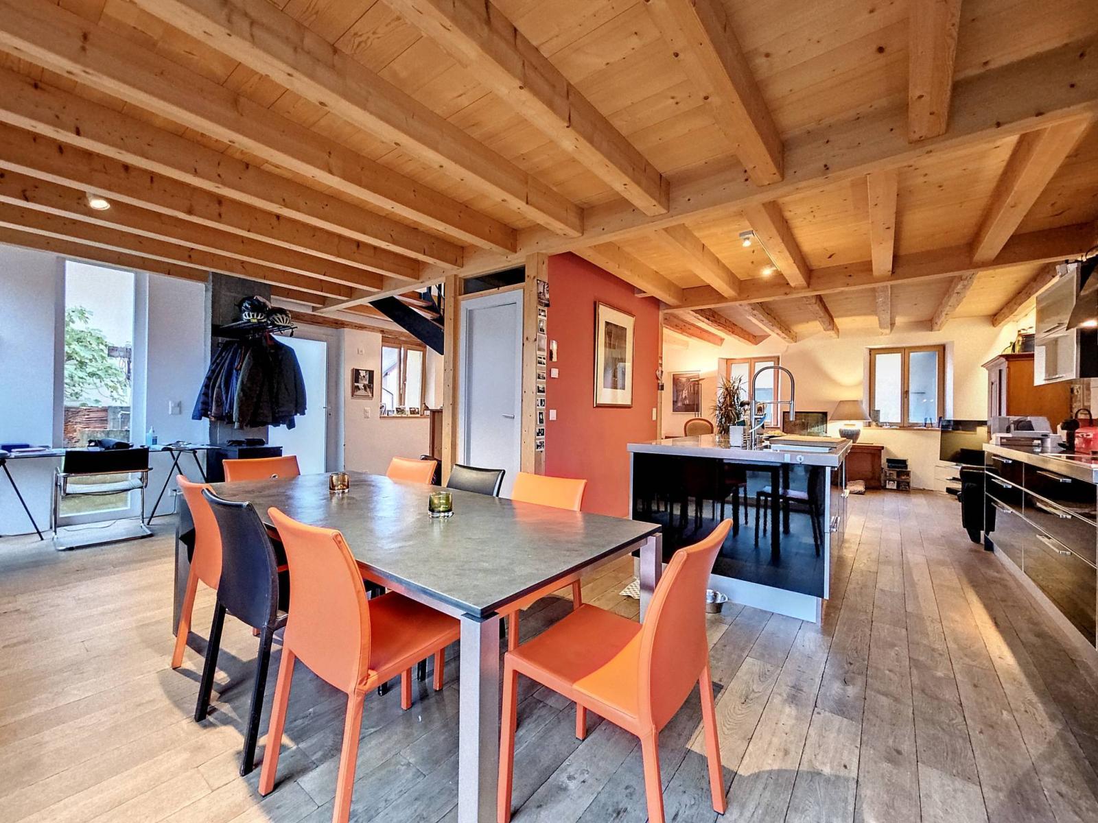 This 7.5 room village house (6.5 rooms + 1 room studio/loft), with a total living space of approximately 240 m², completely renovated in 2009, is semi-detached (partially) on one side, which allows it to have openings on 3 sides. It benefits from a lovely view of the lake from the garden and from the inside via some windows. The triplex typology, but with large open spaces on the first 3 levels (4 in total including the loft on the garden level).