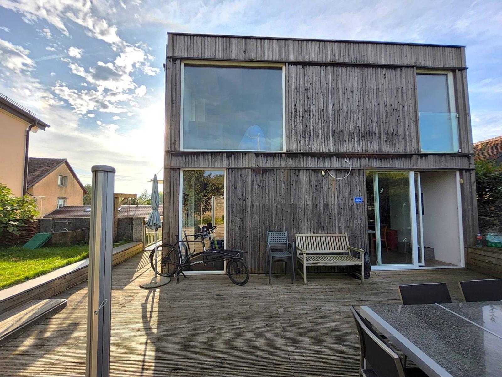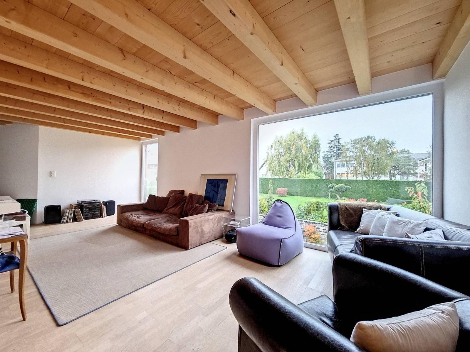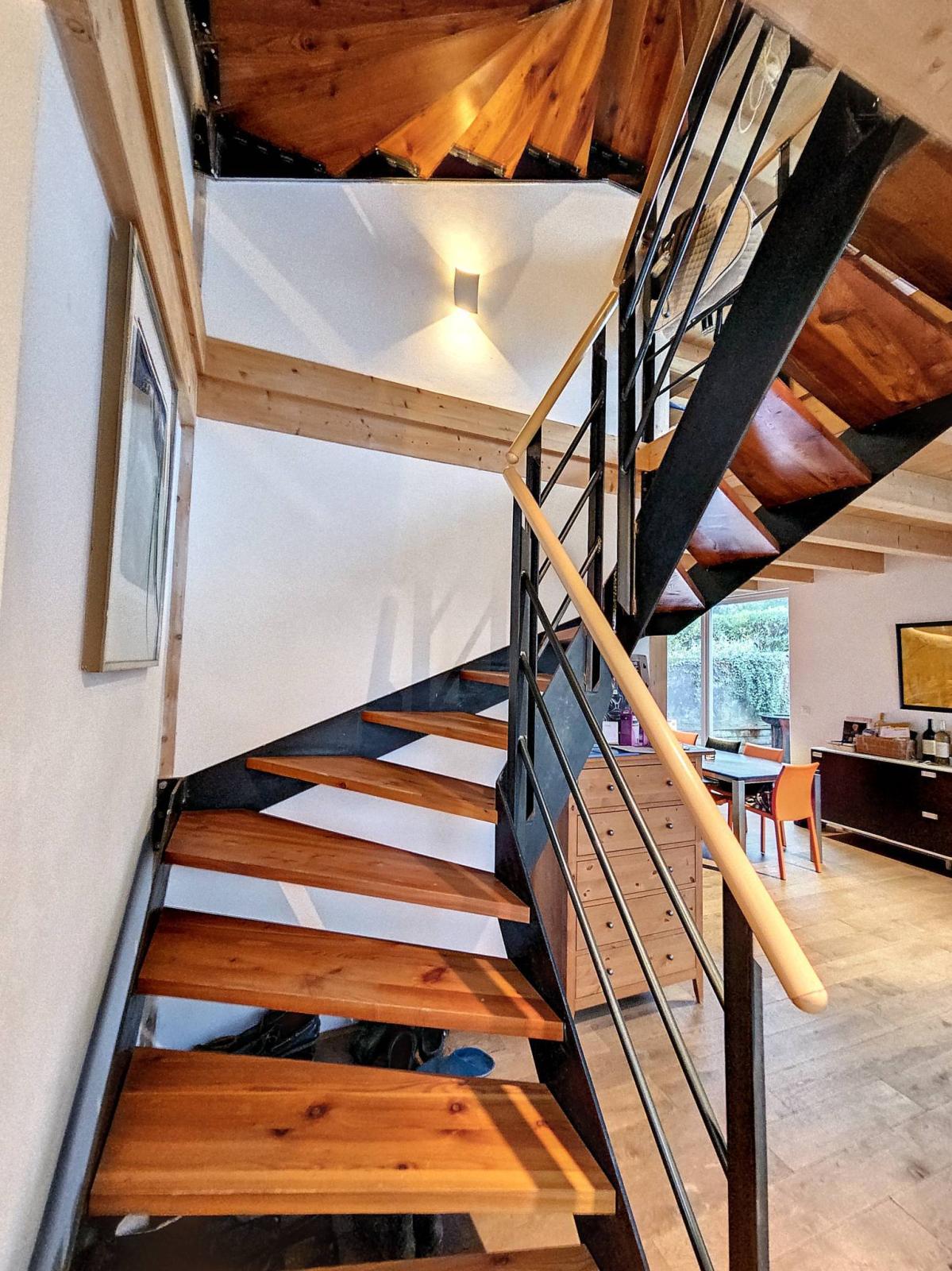 This 7.5 room village house (6.5 rooms + 1 room studio/loft), with a total living space of approximately 240 m², completely renovated in 2009, is semi-detached (partially) on one side, which allows it to have openings on 3 sides. It benefits from a lovely view of the lake from the garden and from the inside via some windows. The triplex typology, but with large open spaces on the first 3 levels (4 in total including the loft on the garden level).