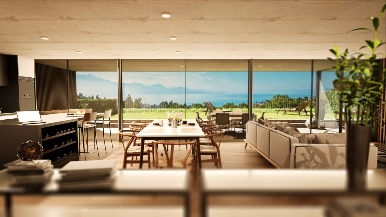 The large loggias allow you to enjoy a breathtaking view of the lake and the mountains while benefiting from absolute calm and the greenery around the habitat.