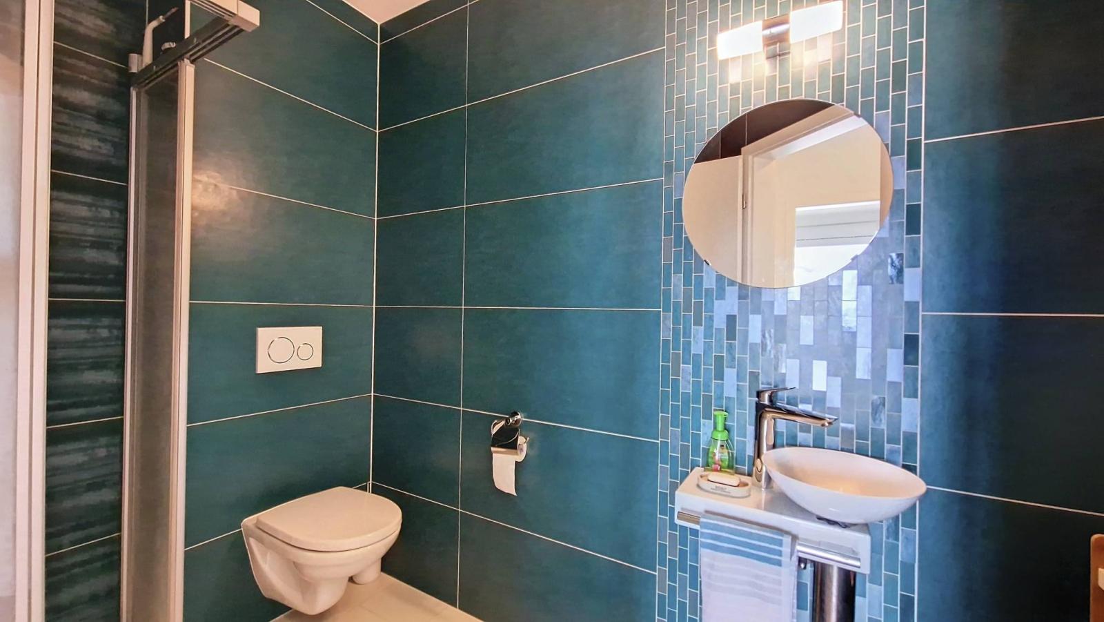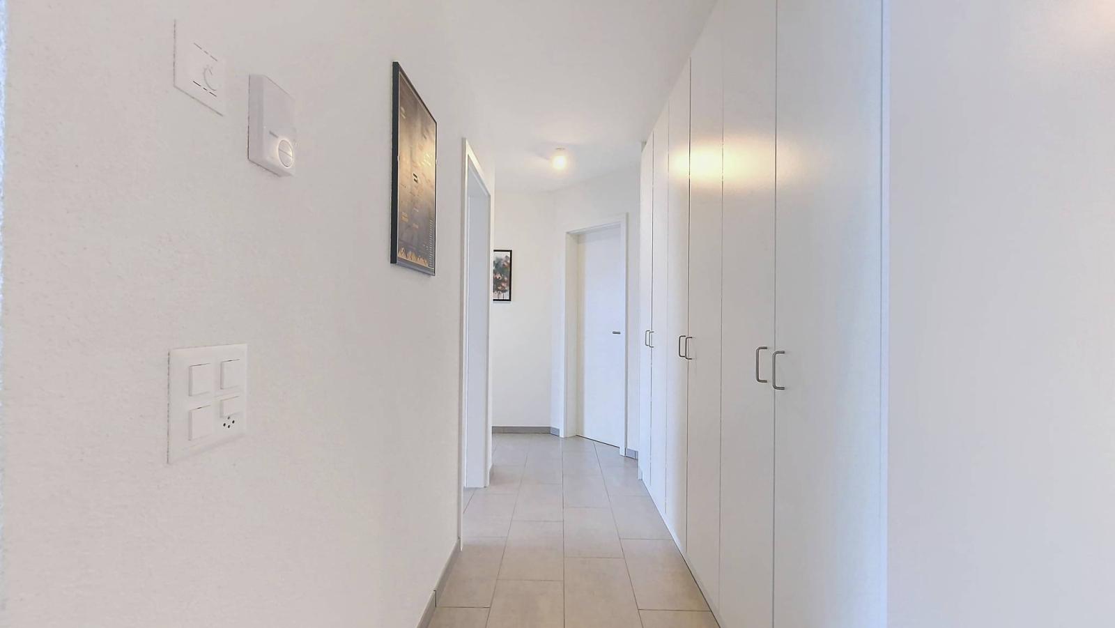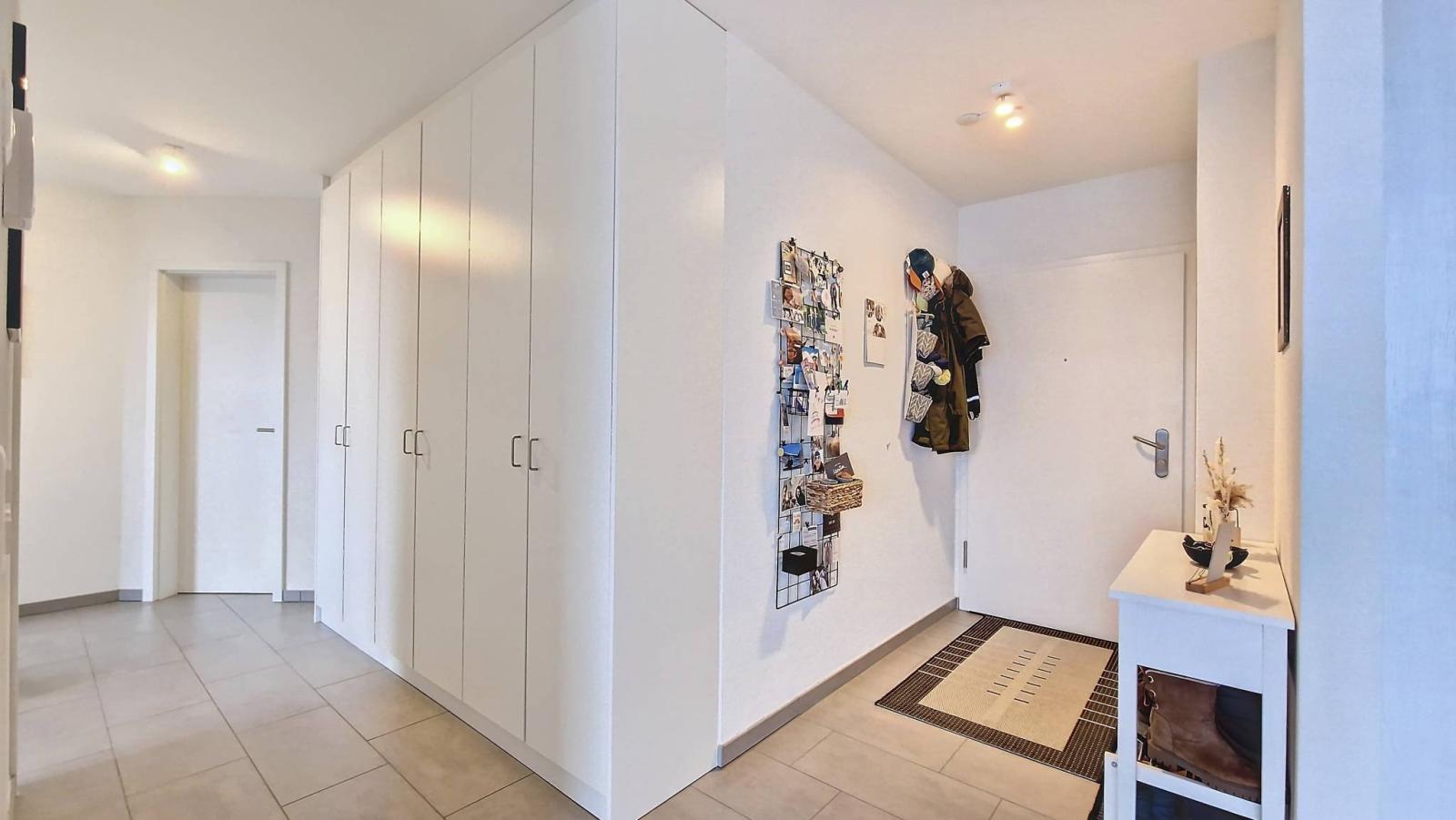 The interior space includes an entrance hall with wall cupboards, a shower toilet and two bedrooms, including a master suite with adjoining bathroom. The fully equipped kitchen opens onto the living room, while a large south-west facing balcony offers a peaceful view of a residential area, protected from noise pollution.