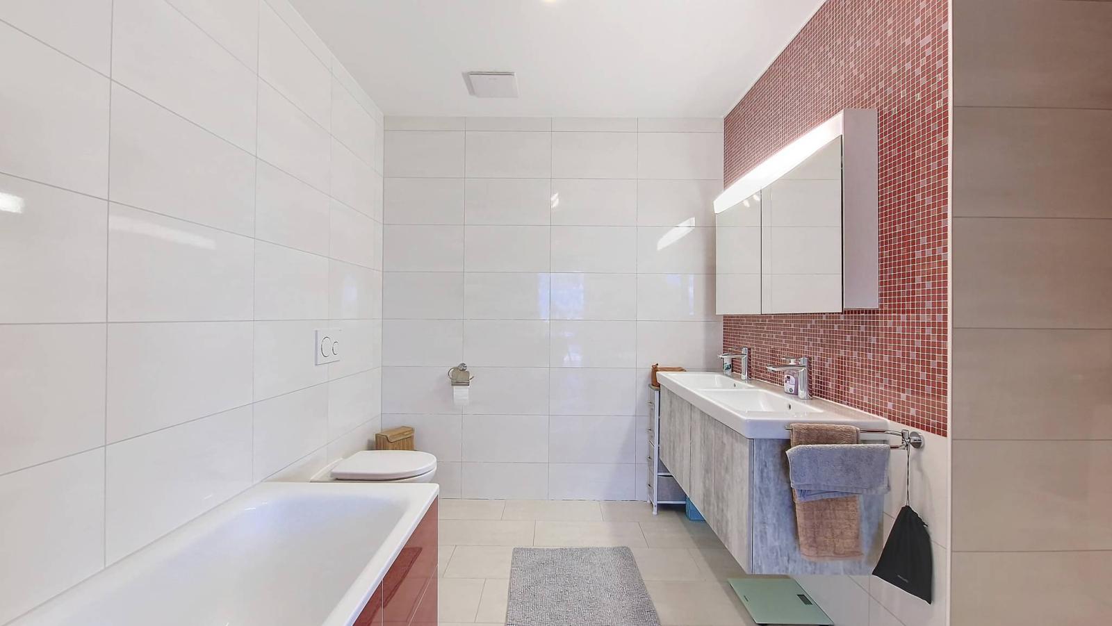Underfloor heating is provided by a heat pump with geothermal probe, and thermal solar panels are installed on the roof.