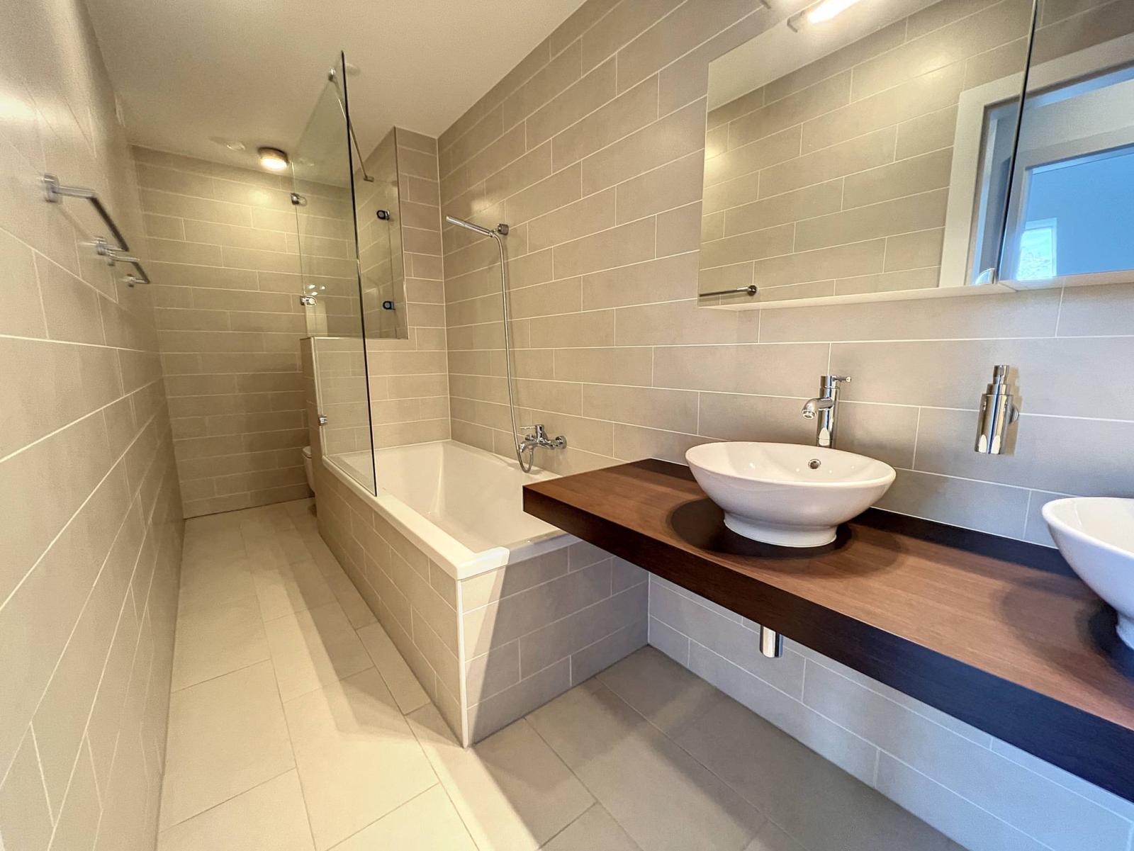 A staircase leads to the upper floor which is dedicated to the parents and has a large hallway with wardrobes, a large bedroom and a bathroom with shower, separate WC and laundry area.