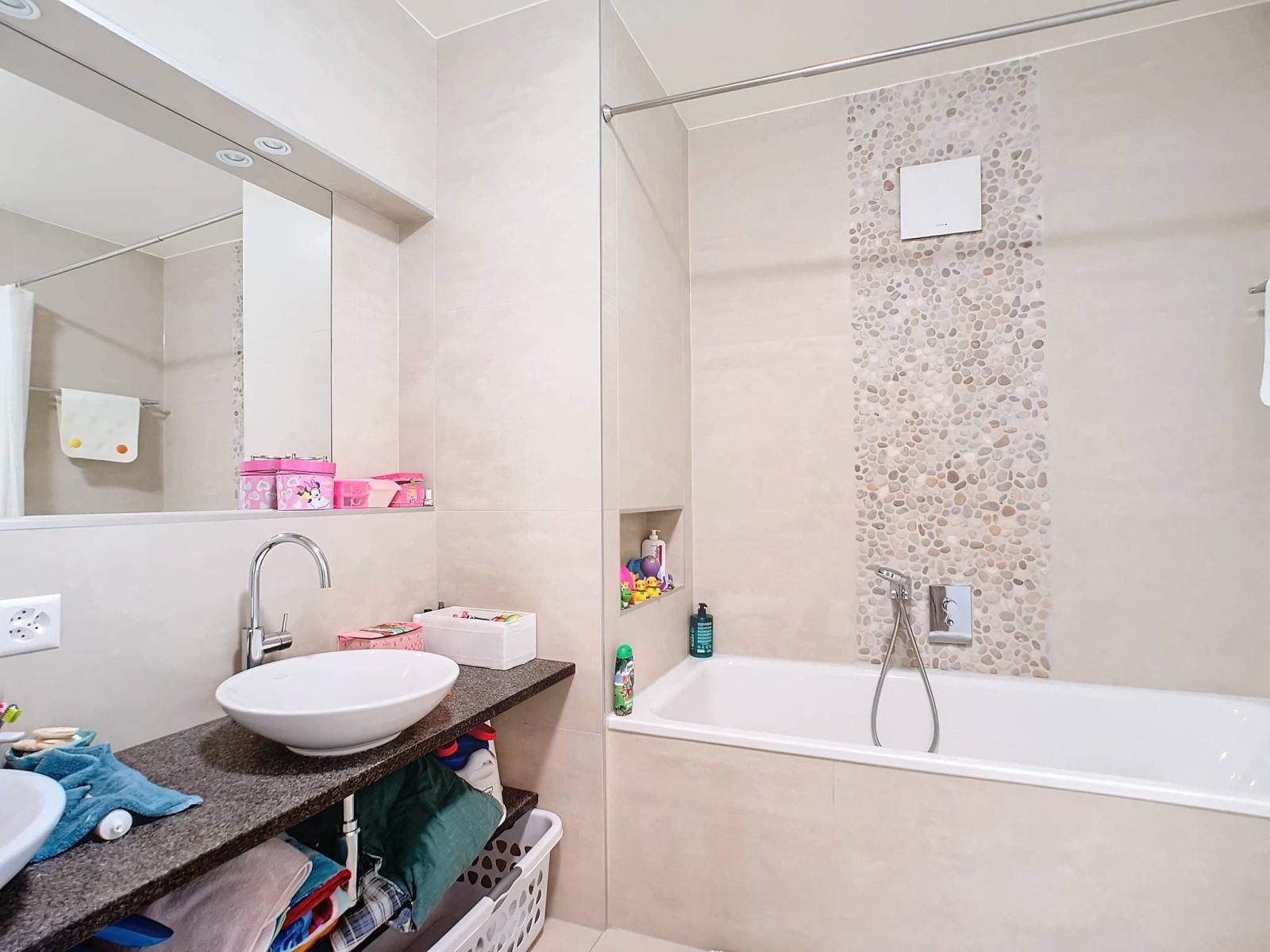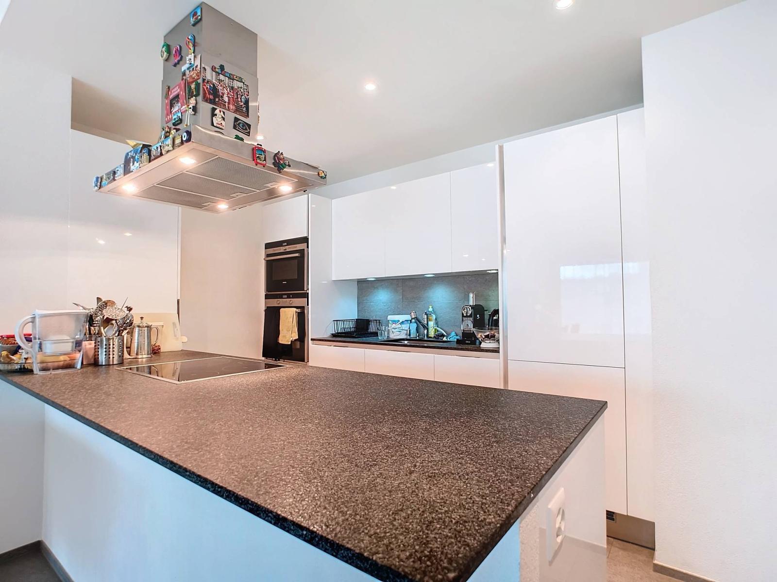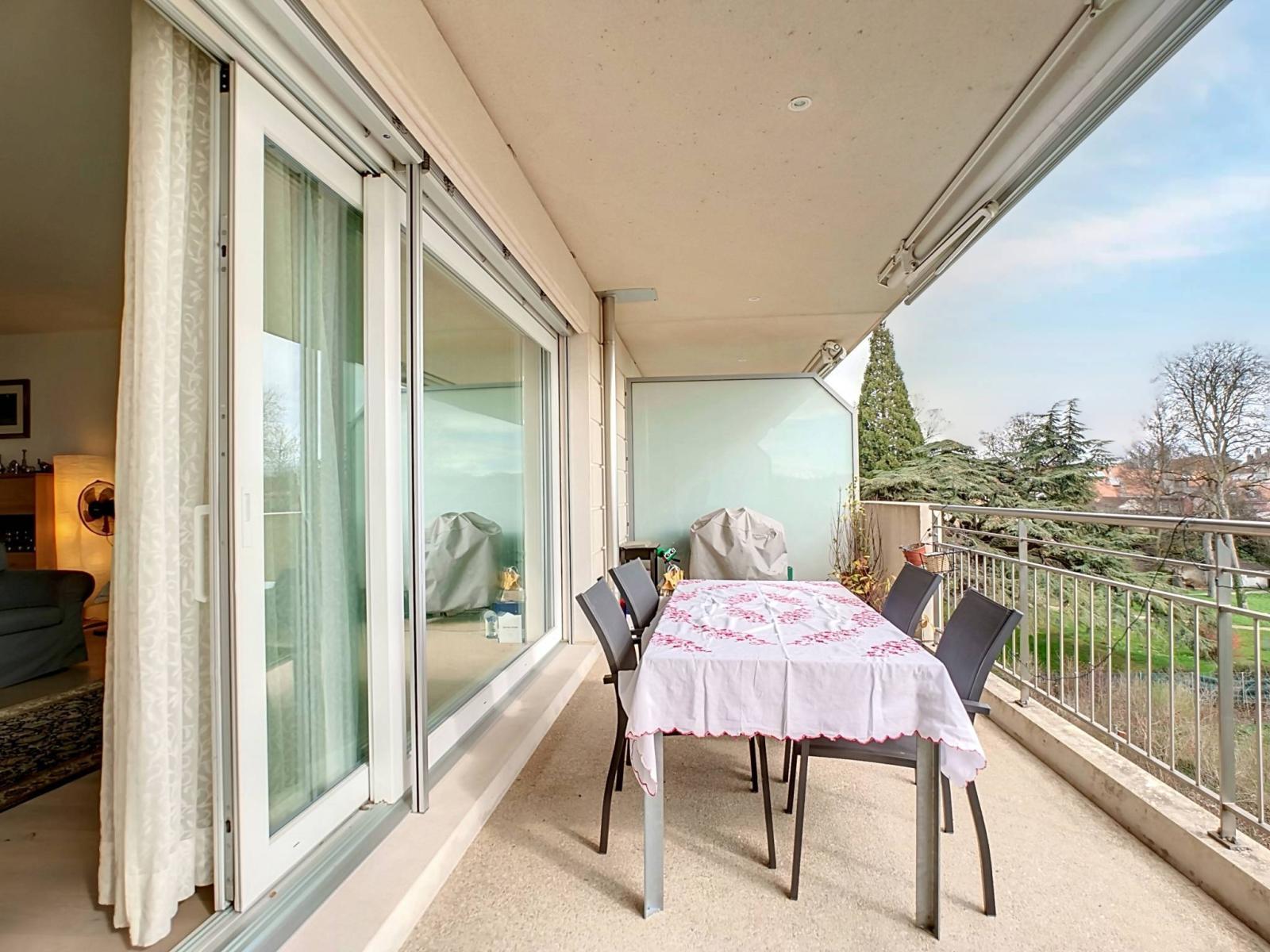 With a sleek and modern style, this 4.5-room apartment offers a living area of approximately 117.5 m² and a high ceiling. It has an entrance hall - with wall cupboards - giving access to the very well-appointed kitchen, the living / dining room and the spacious balcony of approximately 27 m². The apartment has a master suite with an adjoining shower room / wc, two bedrooms, a shower room / wc with washing column and a bathroom / wc.
