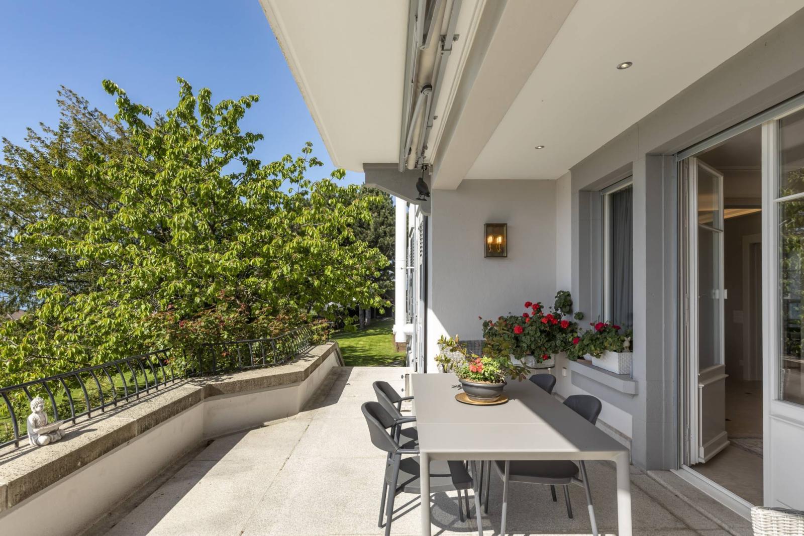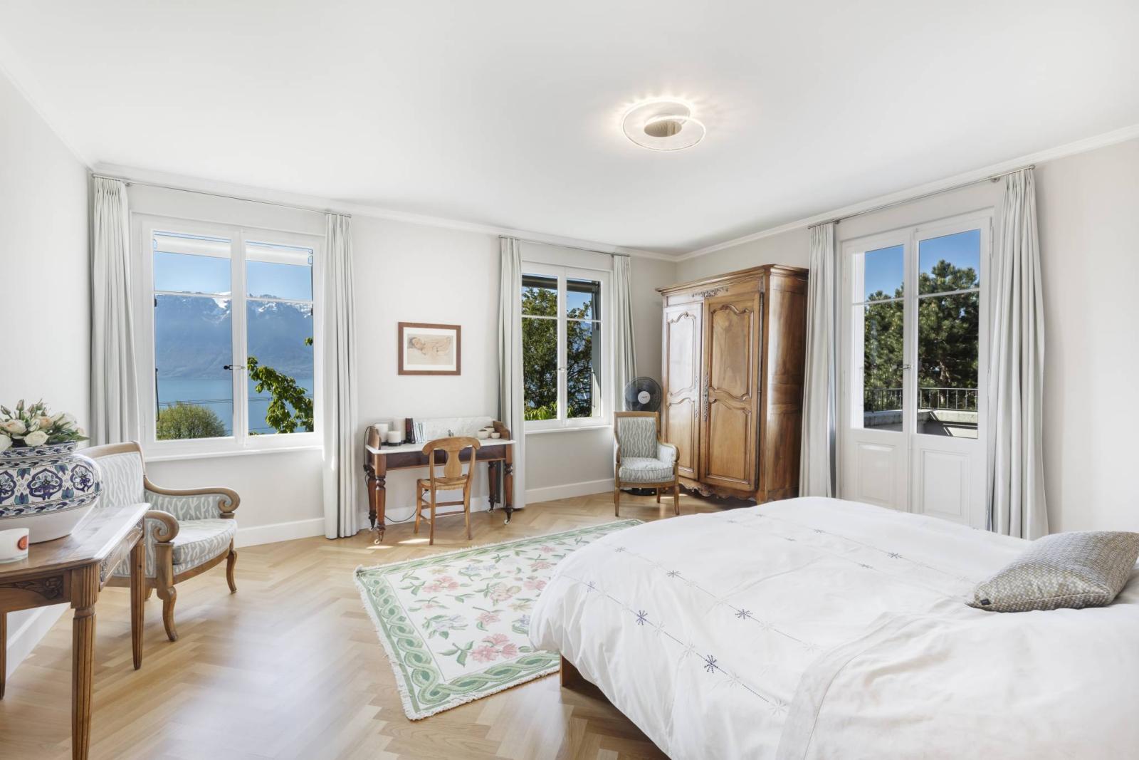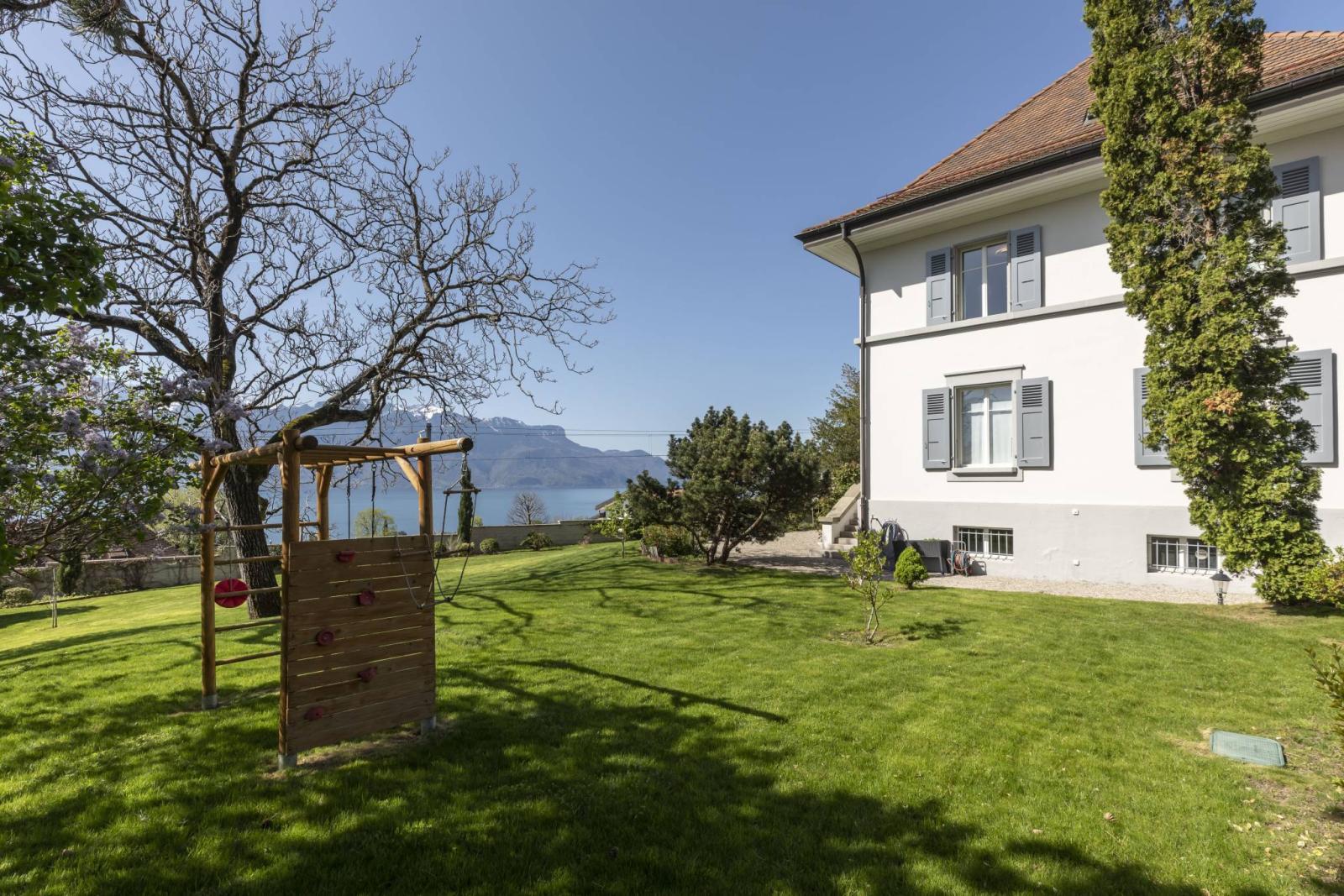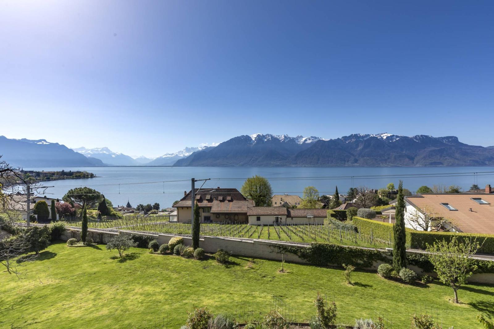 Optimal brightness and panoramic views extending over the lake and the majestic surrounding mountains contribute to creating a serene and captivating atmosphere. A vast, beautifully landscaped garden invites you to relax and offers an idyllic setting to enjoy peaceful moments outdoors, while enjoying the breathtaking panorama that awaits you.
