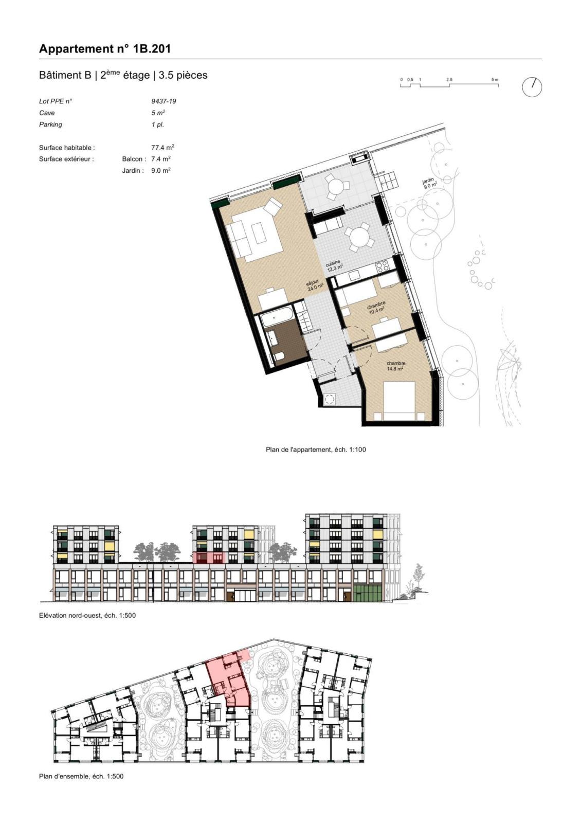 15 3.5 room apartments between 71 and 86 m² with loggia105 parking spaces, including 38 visitor spaces
