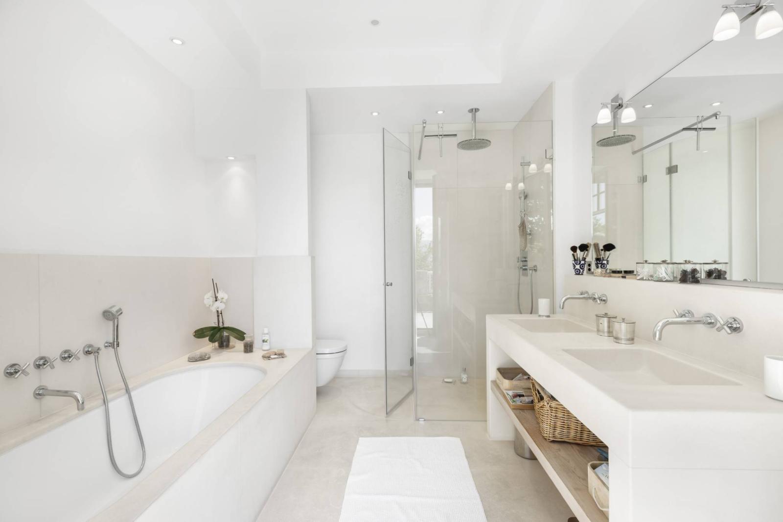 On the first floor, the hallway serves as a library. This level includes a spacious family room with a fireplace, a master bedroom with a dressing room and en-suite bathroom (with both shower and bathtub) opening onto a terrace, two office spaces, and a guest toilet.