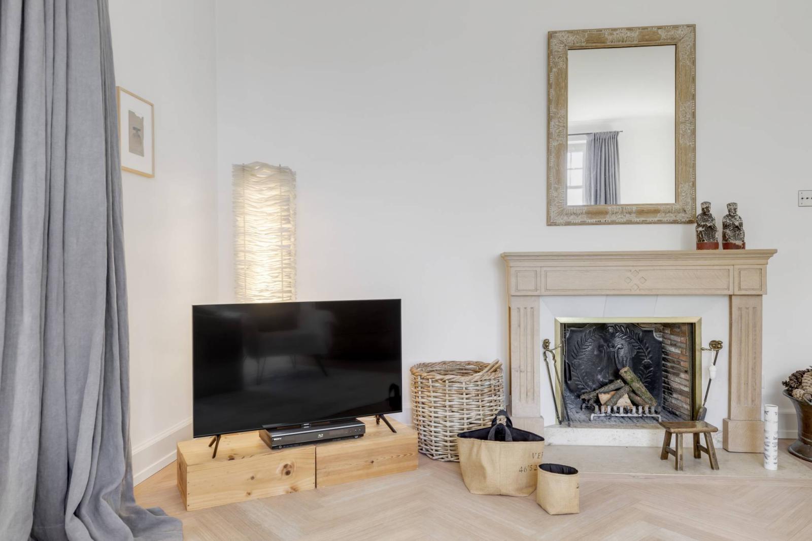The entrance hall is stunning, featuring a grand staircase and a small lounge. In the evening, beautiful light filters through a lovely stained-glass window.